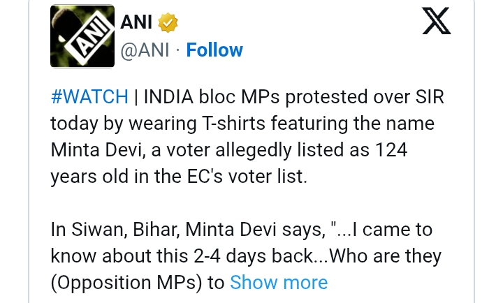 ಮುಂದುವರೆದು, "ಕಾಂಗ್ರೆಸ್ ನಾಯಕರು ನನ್ನ ವಯಸ್ಸಿನ ಬಗ್ಗೆ ಏಕಿಷ್ಟು ತಲೆ ಕೆಡಿಸಿಕೊಂಡಿದ್ದಾರೆ ಎಂಬುದು ಅರ್ಥವಾಗುತ್ತಿಲ್ಲ. ನನ್ನ ವಿವರಗಳನ್ನು ಸರಿಪಡಿಸಬೇಕು ಎಂಬುದಷ್ಟೇ ನನ್ನ ಆಗ್ರಹವಾಗಿದೆ. ಆದರೆ ಕಾಂಗ್ರೆಸ್ ನಾಯಕರು ನನ್ನ ಅನುಮತಿ ಇಲ್ಲದೇ ನನ್ನ ಫೊಟೋವನ್ನು ಟೀ-ಶರ್ಟ್ ಮೇಲೆ ಅಚ್ಚು ಹಾಕಿಸಿಕೊಂಡು ಪ್ರತಿಭಟನೆ ಮಾಡುತ್ತಿದ್ದಾರೆ. ಹೀಗೆ ಮಾಡಲು ಅವರಿಗೆ ಅಧಿಕಾರ ಕೊಟ್ಟವರು ಯಾರು? ಎಂದು ಮಿಂಟಾ ದೇವಿ ಖಾರವಾಗಿ ಪ್ರಶ್ನಿಸಿದ್ದಾರೆ. ಬಿಹಾರ ಮತದಾರರ ಪಟ್ಟಿ ಪರಿಷ್ಕರಣೆ ವಿವಾದ ಇದೀಗ ದೇಶಾದ್ಯಂತ ಗಮನ ಸೆಳೆಯುತ್ತಿದೆ.