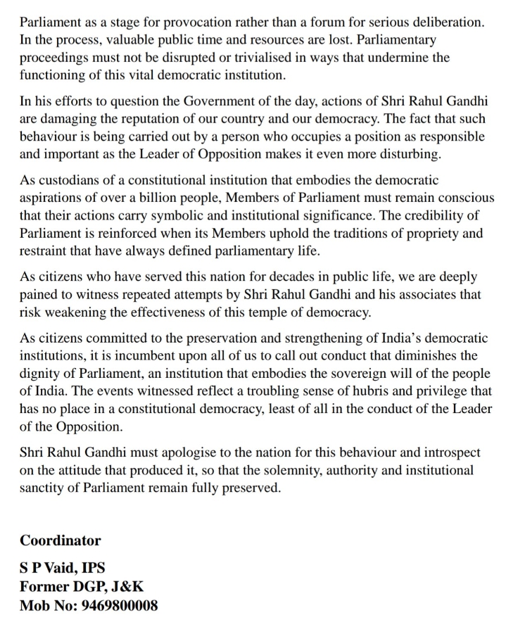 ರಾಹುಲ್ ಗಾಂಧಿ ಈ ವರ್ತನೆಗಾಗಿ ರಾಷ್ಟ್ರದ ಕ್ಷಮೆಯಾಚಿಸಬೇಕು. ಸಂಸತ್ತಿನ ಘನತೆ, ಅಧಿಕಾರ ಮತ್ತು ಸಾಂಸ್ಥಿಕ ಪಾವಿತ್ರ್ಯವನ್ನು ಕಾಪಾಡಲು ಆತ್ಮಾವಲೋಕನ ಮಾಡಿಕೊಳ್ಳಬೇಕು ಎಂದು ಮಾಜಿ ಅಧಿಕಾರಿಗಳು ಮತ್ತು ನ್ಯಾಯಾಧೀಶರು ಸ್ಪಷ್ಟವಾಗಿ ಹೇಳಿದ್ದಾರೆ. ಪ್ರಜಾಪ್ರಭುತ್ವ ಸಂಸ್ಥೆಗಳಿಗೆ ಮಾಡಲಾಗುವ ಇಂತಹ ನಿರಂತರ ಅಗೌರವವು ಸಂಸತ್ತಿನ ವಿಶ್ವಾಸಾರ್ಹತೆಯನ್ನು ಹಾಳು ಮಾಡುವುದಲ್ಲದೆ, ಪ್ರಜಾಪ್ರಭುತ್ವದ ಅಡಿಪಾಯವನ್ನು ಅಲುಗಾಡಿಸುವ ಬೆದರಿಕೆ ಹಾಕುತ್ತದೆ ಎಂದು ಪತ್ರವು ಎಚ್ಚರಿಸಿದೆ. ಈ ಬಗ್ಗೆ ANI ಜೊತೆ ಮಾತನಾಡಿದ ಎಸ್ಪಿ ವೈದ್, 'ಸಂಸತ್ತಿನಲ್ಲಿ ರಾಹುಲ್ ಗಾಂಧಿ ಅವರ ನಡವಳಿಕೆಯು ಹಕ್ಕು ಮತ್ತು ದುರಹಂಕಾರದ ಪ್ರಜ್ಞೆಯನ್ನು ತೋರಿಸುತ್ತದೆ. ರಾಹುಲ್ ಗಾಂಧಿಯವರ ಸಂಸತ್ತಿನಲ್ಲಿ ಅವರ ನಡವಳಿಕೆ ವಿರೋಧ ಪಕ್ಷದ ನಾಯಕನ ನಡವಳಿಕೆಗೆ ತಕ್ಕುದಲ್ಲ, ಇದು ತುಂಬಾ ಜವಾಬ್ದಾರಿಯುತ ಹುದ್ದೆ ಎಂಬುದನ್ನು ಅವರು ಅರಿಯಬೇಕು. ತಮ್ಮ ಸ್ಥಾನದ ಗೌರವಕ್ಕೆ ತಕ್ಕಂತೆ ನಡೆದುಕೊಳ್ಳಬೇಕು' ಎಂದಿದ್ದಾರೆ.