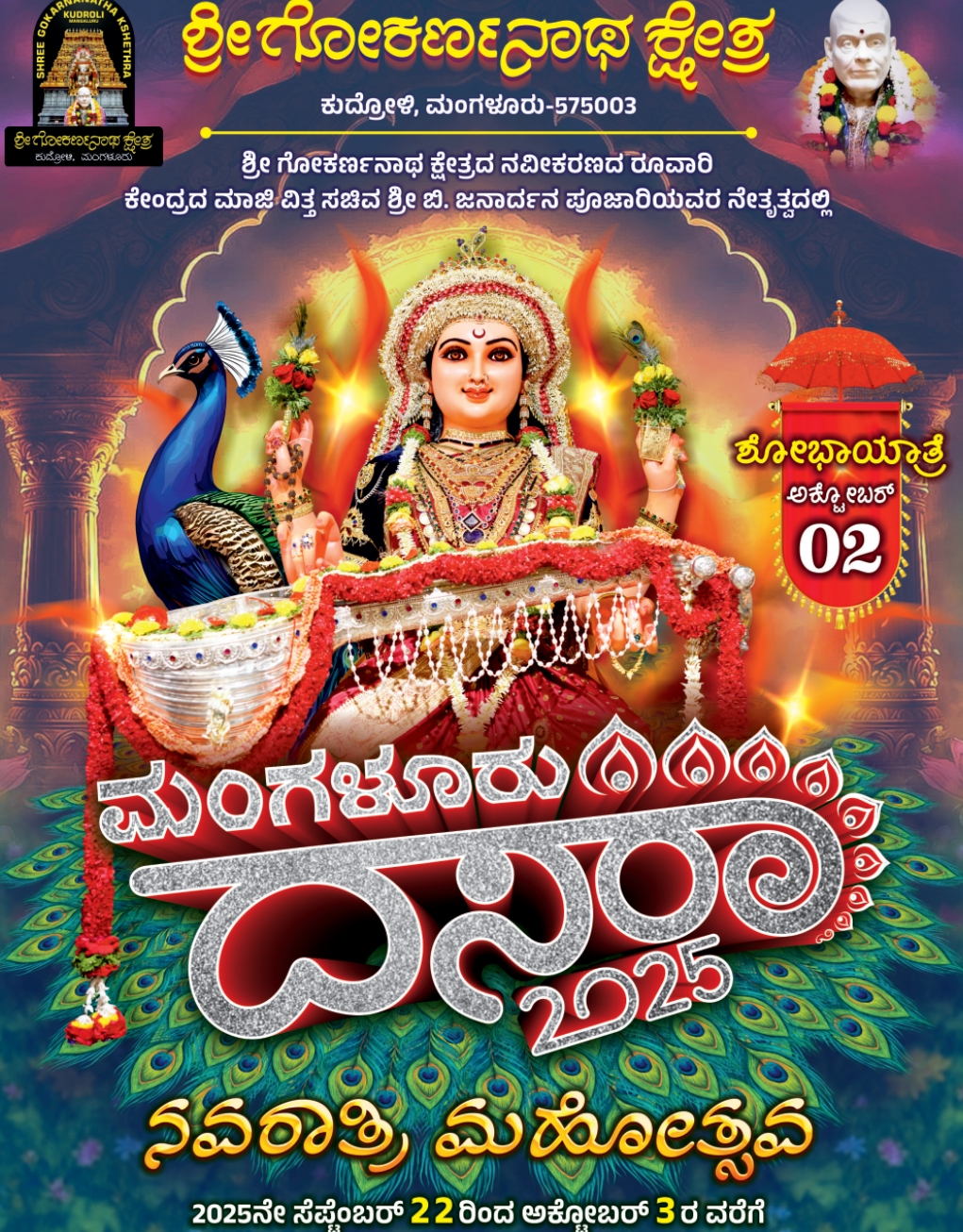 ಮಂಗಳೂರು: ಕುದ್ರೋಳಿ ಶ್ರೀ ಗೋಕರ್ಣನಾಥ ಕ್ಷೇತ್ರದಲ್ಲಿ ಸೆ.22ರಂದು ಅಕ್ಟೋಬರ್ 3ರವರೆಗೆ ಮಂಗಳೂರು ದಸರಾ ಮಹೋತ್ಸವ ಜರುಗಲಿದೆ.ಸೆ.22ರಂದು ಬೆಳಗ್ಗೆ 8.30ಕ್ಕೆ ಗುರು ಪ್ರಾರ್ಥನೆಯೊಂದಿಗೆ ಪುಣ್ಯಾಹ ಹೋಮ ನವಕಲಶಾಭಿಷೇಕ ನಡೆದು ಪೂರ್ವಾಹ್ನ 12ಗಂಟೆಗೆ ನವದುರ್ಗೆಯರು, ಮಹಾಗಣಪತಿ ಹಾಗೂ ಶ್ರೀ ಶಾರದಾ ಮಾತೆಯ ಪ್ರತಿಷ್ಠಾಪನೆಯೊಂದಿಗೆ ಪ್ರಾರಂಭಗೊಂಡು ಅಕ್ಟೋಬರ್ 3ರ ತನಕ ಕೇಂದ್ರದ ಮಾಜಿ ಸಚಿವರು, ಕ್ಷೇತ್ರದ ಅಭಿವೃದ್ಧಿಯ ರುವಾರಿ ಶ್ರೀ ಬಿ.ಜನಾರ್ದನ ಪೂಜಾರಿಯವರ ಮಾರ್ಗದರ್ಶನದಲ್ಲಿ ಮಂಗಳೂರು ದಸರಾ (ನವರಾತ್ರಿ ಮಹೋತ್ಸವ) ಧಾರ್ಮಿಕ, ಸಾಂಸ್ಕೃತಿಕ ಕಾರ್ಯಕ್ರಮದೊಂದಿಗೆ ವಿಜೃಂಬನೆಯಿಂದ ಜರುಗಲಿದೆ ಎಂದು ಎಂದು ಶ್ರೀ ಕ್ಷೇತ್ರದ ಕೋಶಾಧಿಕಾರಿಯಾದ ಪದ್ಮರಾಜ್ ಆರ್ ತಿಳಿಸಿದರು. ಗೋಕರ್ನಾಥೇಶ್ವರ ದೇವಾಲಯದ ಸಭಾಂಗಣದಲ್ಲಿ ನಡೆದ ಪತ್ರಿಕಾಗೋಷ್ಠಿಯಲ್ಲಿ ಮಾಹಿತಿ ನೀಡಿದ ಅವರು,