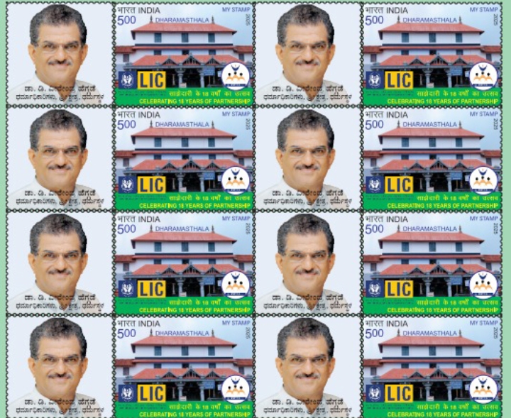 ಶ್ರೀ ಕ್ಷೇತ್ರ ಧರ್ಮಸ್ಥಳ : ಧರ್ಮಾಧಿಕಾರಿಗಳಾದ ಡಾ|| ಡಿ. ವೀರೇಂದ್ರ ಹೆಗ್ಗಡೆಯವರು ಕರ್ನಾಟಕ ರಾಜ್ಯದಲ್ಲಿ ಗ್ರಾಮಾಭಿವೃದ್ಧಿಗೆ ನೀಡಿದ ಕೊಡುಗೆಯನ್ನು ಪರಿಗಣಿಸಿ ಭಾರತೀಯ ಜೀವ ವಿಮಾ ನಿಗಮವು ತಮ್ಮ ವಿಮಾ ಸೇವೆಯನ್ನು ಗ್ರಾಮ ಗ್ರಾಮಗಳಿಗೆ ನೀಡುತ್ತಿರುವ ಪಾಲುದಾರ ಸಂಸ್ಥೆಯಾದ ಗ್ರಾಮಾಭಿವೃದ್ಧಿ ಯೋಜನೆಯೊಂದಿಗೆ ಜಂಟಿಯಾಗಿ ಸೇರಿಕೊಂಡು ಡಾ|| ಡಿ. ವೀರೇಂದ್ರ ಹೆಗ್ಗಡೆಯವರ ಅಂಚೆ ಚೀಟಿಯನ್ನು ಬಿಡುಗಡೆಗೊಳಿಸಲಾಯಿತು. ಭಾರತೀಯ ಜೀವ ವಿಮಾ ನಿಗಮ ಮತ್ತು ಗ್ರಾಮಾಭಿವೃದ್ಧಿ ಯೋಜನೆ ಕರ್ನಾಟಕ ರಾಜ್ಯದ ಗ್ರಾಮದಲ್ಲಿರುವ ಆರ್ಥಿಕ ಹಿಂದುಳಿದ ಹಾಗೂ ಸ್ವಸಹಾಯ ಸಂಘಗಳ ಸದಸ್ಯರಿಗಾಗಿ ವಿಶೇಷ ಕಿರು ಮೈಕ್ರೋ ಇನ್ಸೂರೆನ್ಸ್ ಸೇವೆ ನೀಡುವ ಮೂಲಕ ದೇಶಕ್ಕೆ ಮಾದರಿ ವ್ಯವಸ್ಥೆಯಾಗಿದೆ. ಈ ಸಾಧನೆಯೊಂದಿಗೆ ಅನೇಕ ಕ್ಷೇತ್ರಗಳಲ್ಲಿ ಪೂಜ್ಯರು ನೀಡಿದ ಅನನ್ಯ ಕೊಡುಗೆಗಳನ್ನು ಗೌರವಿಸುವ ಸಲುವಾಗಿ ಮೂರು ಸಂಸ್ಥೆಗಳು ಭಾರತೀಯ ಅಂಚೆ ಇಲಾಖೆಯಿಂದ ಶ್ರೀ ಹೆಗ್ಗಡೆಯವರ ಅಂಚೆ ಚೀಟಿಯನ್ನು ಶ್ರೀ ಹೆಗ್ಗಡೆಯವರ ಜನ್ಮ ದಿನದಂದು ಬಿಡುಗಡೆಗೊಳಿಸಿದ್ದು ವಿಶೇಷವಾಗಿತ್ತು. ಶೃತಿ ಎಂಬ ರೋಬೋ ಅಂಚೆ ಚೀಟಿಯನ್ನು ಬಿಡುಗಡೆಗೆ ವೇದಿಕೆಗೆ ತಂದುಕೊಟ್ಟಿದ್ದು ಎಲ್ಲರ ಮೆಚ್ಚುಗೆಗೆ ಪಾತ್ರವಾಯಿತು.
