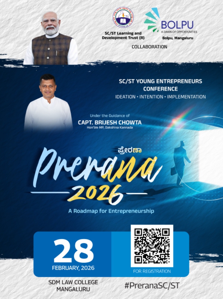 ಮಂಗಳೂರು: ಪರಿಶಿಷ್ಟ ಜಾತಿ ಹಾಗೂ ಪರಿಶಿಷ್ಟ ಪಂಗಡದ ವಿದ್ಯಾರ್ಥಿಗಳನ್ನು ಉದ್ಯಮಶೀಲತೆಯತ್ತ ಸೆಳೆಯುವ ಹಾಗೂ ಅವರಿಗೆ ಭವಿಷ್ಯದಲ್ಲಿ ಸ್ವಂತ ಉದ್ಯಮ ಸ್ಥಾಪಿಸಲು ಬೇಕಾಗುವ ಅಗತ್ಯ ಮಾರ್ಗದರ್ಶನ ನೀಡುವ ದೃಷ್ಟಿಯಿಂದ ಮಂಗಳೂರಿನಲ್ಲಿ ಫೆ.28ರಂದು ‘ಪ್ರೇರಣಾ-2026’ ಉದ್ಯಮಶೀಲತಾ ಸಮಾವೇಶ ಹಮ್ಮಿಕೊಳ್ಳಲಾಗಿದೆ ಎಂದು ಸಂಸದ ಕ್ಯಾ. ಬ್ರಿಜೇಶ್ ಚೌಟ ತಿಳಿಸಿದ್ದಾರೆ.