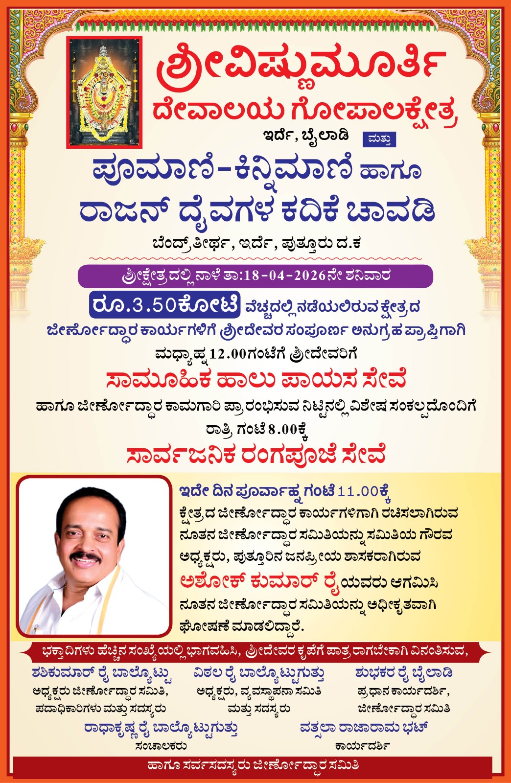 ಪುತ್ತೂರು : ಪುತ್ತೂರು ತಾಲೂಕಿನ ಇರ್ದೆ, ಬೈಲಾಡಿ ಮತ್ತು ಬೆಂದ್ರ್ತೀರ್ಥ ವ್ಯಾಪ್ತಿಯ ಪವಿತ್ರ ಕ್ಷೇತ್ರವಾದ ಶ್ರೀ ವಿಷ್ಣುಮೂರ್ತಿ ದೇವಾಲಯ ಗೋಪಾಲಕ್ಷೇತ್ರದಲ್ಲಿ ಸುಮಾರು 3.50 ಕೋಟಿ ರೂಪಾಯಿ ವೆಚ್ಚದಲ್ಲಿ ಭವ್ಯ ಜೀರ್ಣೋದ್ಧಾರ ಕಾರ್ಯಗಳು ನಡೆಯಲಿದ್ದು, ಈ ಸಂಬಂಧ ಏಪ್ರಿಲ್ 18, 2026ರ ಶನಿವಾರದಂದು ವಿಶೇಷ ಧಾರ್ಮಿಕ ಕಾರ್ಯಕ್ರಮಗಳನ್ನು ಹಮ್ಮಿಕೊಳ್ಳಲಾಗಿದೆ. ದೇವಸ್ಥಾನದ ಅಭಿವೃದ್ಧಿಗಾಗಿ ರಚಿಸಲಾಗಿರುವ ನೂತನ ಜೀರ್ಣೋದ್ಧಾರ ಸಮಿತಿಯನ್ನು ಪುತ್ತೂರಿನ ಜನಪ್ರಿಯ ಶಾಸಕರಾದ ಶ್ರೀ ಅಶೋಕ್ ಕುಮಾರ್ ರೈ ಅವರು ಅಂದು ಪೂರ್ವಾಹ್ನ 11:00 ಗಂಟೆಗೆ ಅಧಿಕೃತವಾಗಿ ಘೋಷಿಸಲಿದ್ದಾರೆ.