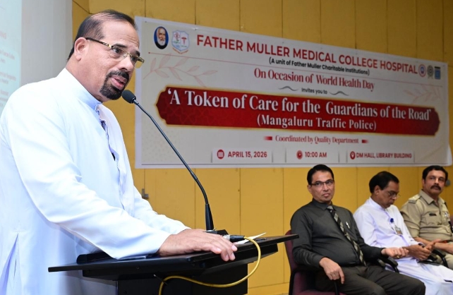 ಮಂಗಳೂರು : ಫಾದರ್ ಮುಲ್ಲರ್ ವೈದ್ಯಕೀಯ ಕಾಲೇಜು ಆಸ್ಪತ್ರೆಯು 2026ರ ವಿಶ್ವ ಆರೋಗ್ಯ ದಿನದ ಅಂಗವಾಗಿ ಮಂಗಳೂರು ಸಂಚಾರಿ ಪೊಲೀಸ್ ಸಿಬ್ಬಂದಿಗಳಿಗಾಗಿ "ರಸ್ತೆಯ ರಕ್ಷಕರಿಗೆ ಆರೈಕೆಯ ಸಂಕೇತ" ಎಂಬ ವಿಶೇಷ ಆರೋಗ್ಯ ಜಾಗೃತಿ ಕಾರ್ಯಕ್ರಮವನ್ನು ಹಮ್ಮಿಕೊಂಡಿತ್ತು. "ಒಟ್ಟಾಗಿ ಆರೋಗ್ಯಕ್ಕಾಗಿ: ವಿಜ್ಞಾನದೊಂದಿಗೆ ನಿಲ್ಲಿ" ಎಂಬ ಧ್ಯೇಯವಾಕ್ಯದಡಿ ಆಯೋಜಿಸಲಾದ ಈ ಕಾರ್ಯಕ್ರಮದಲ್ಲಿ ನಗರದ ಸುಮಾರು 150ಕ್ಕೂ ಹೆಚ್ಚು ಸಂಚಾರಿ ಪೊಲೀಸರು ಭಾಗವಹಿಸಿ ತಮ್ಮ ಆರೋಗ್ಯ ರಕ್ಷಣೆಯ ಬಗ್ಗೆ ಮಾಹಿತಿ ಪಡೆದುಕೊಂಡರು. ಕಾರ್ಯಕ್ರಮದ ಆರಂಭದಲ್ಲಿ ವೈದ್ಯಕೀಯ ಅಧೀಕ್ಷಕರಾದ ಡಾ. ಉದಯ್ ಕುಮಾರ್ ಸ್ವಾಗತಿಸಿದರು.