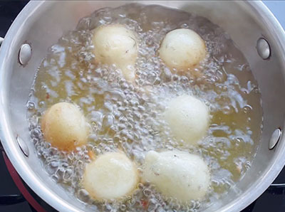 ನಂತರ ಬಾಣಲೆಯಲ್ಲಿ ಎಣ್ಣೆ ಕಾಯಲು ಇಡಬೇಕು, ಎಣ್ಣೆ ಕಾದ ಮೇಲೆ ಕಲಸಿದ ಮಿಶ್ರಣವನ್ನು ಮದ್ಯಮ ಗಾತ್ರದ ಉಂಡೆಯಾಕಾರದ ಗೋಲಿ ಮಾಡಿ ಎಣ್ಣೆಯಲ್ಲಿ ಹಾಕಿ ಹೊಂಬಣ್ಣಕ್ಕೆ ಬರುವವರೆಗೂ ಕರಿದು ತೆಗೆದರೆ ಬಿಸಿಬಿಸಿಯಾದ ಗೋಲಿಬಜೆ ಅಥವಾ ಮಂಗಳೂರು ಬೋಂಡ ಸವಿಯಲು ಸಿದ್ದ.