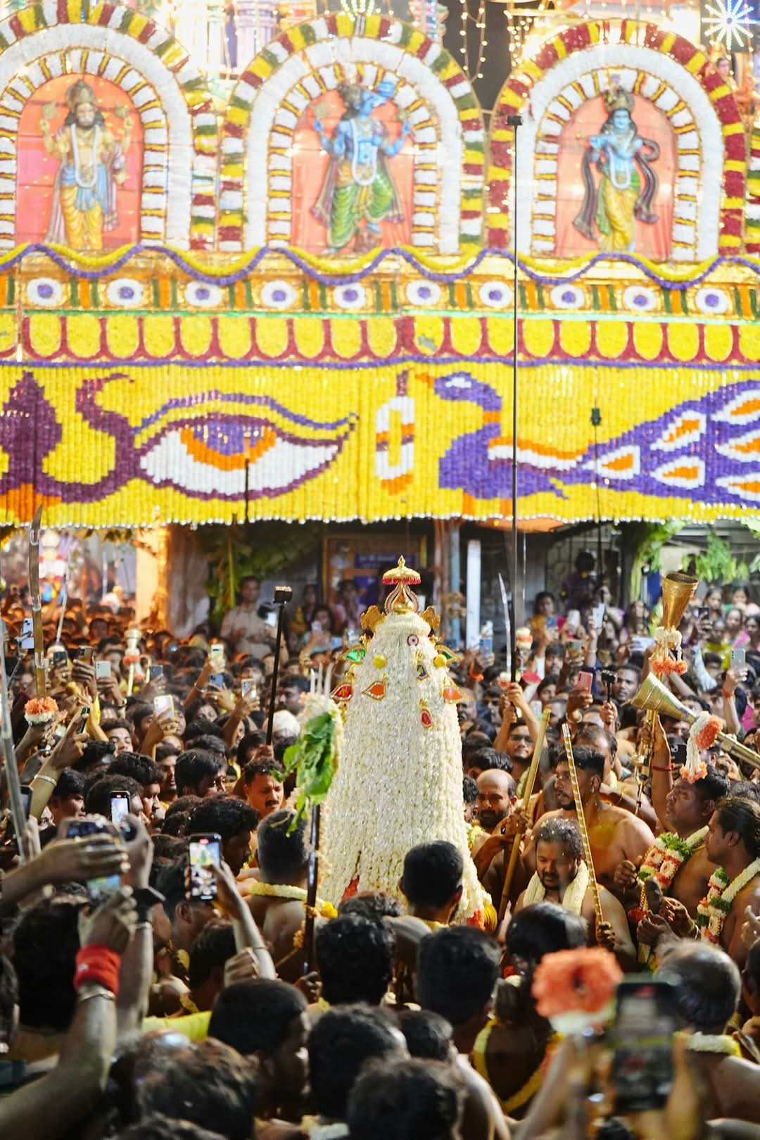 ಚೈತ್ರಶುದ್ಧ ಹುಣ್ಣಿಮೆಯಂದು, ಸಂಜೆ, ಕರಗ ಪೂಜಾರಿ ವಾಪನ ಸಂಸ್ಕಾರ ಮಾಡುತ್ತಾರೆ, ಬಳೆಗಳನ್ನು ಧರಿಸುತ್ತಾರೆ ಮತ್ತು ಒಂದು ಕೈ ಬಳೆಗಳನ್ನು ಧರಿಸುತ್ತಾರೆ. ದೇವಾಲಯದಲ್ಲಿ ವೈಷ್ಣವ ಶೈಲಿಯಲ್ಲಿ ಪೂಜೆ ಮತ್ತು ಹೋಮವನ್ನು ನಡೆಸಲಾಗುತ್ತದೆ. ನಂತರ ಅರ್ಜುನ ಮತ್ತು ದ್ರೌಪದಿಯ ಕಲ್ಯಾಣೋತ್ಸವವನ್ನು ನಡೆಸಲಾಗುತ್ತದೆ. ರಾತ್ರಿಯಲ್ಲಿ ಕರಗ ಕರಡಿ ಪೂಜಾರಿ, ಬಂಡಿ ಪೂಜಾರಿ, ವೀರಕುಮಾರರು ಸಂಪAಗಿ ಸರೋವರದಲ್ಲಿ ಭೇಟಿಯಾಗುತ್ತಾರೆ. ಪೂಜಾರಿಯನ್ನು ಅಚ್ಚಮಲ್ಲಿಗೆ, ಜಡೆಕುಚ್ಚು, ಹೂಮಾಲೆಗಳಿಂದ ಅಲಂಕರಿಸಲಾಗುತ್ತದೆ, ಪೂಜಾರಿ ಅರಿಶಿನ ಬಣ್ಣದ ಸೀರೆಯನ್ನು ಧರಿಸಿ, ಹವಳದ ಹಾರ ಮತ್ತು ಆಭರಣಗಳಿಂದ ಅಲಂಕರಿಸಲಾಗುತ್ತದೆ. ಕರಗ ಪೂಜಾರಿಯನ್ನು ವಧುವಿನಂತೆ ಅಲಂಕರಿಸಲಾಗುತ್ತದೆ. ನಂತರ ದೈವಿಕವಾಗಿ ಅಧಿಕಾರ ಪಡೆದ ಕರಗ ಪೂಜಾರಿಗೆ ಧೂಪ, ದೀಪ ಮತ್ತು ಆರತಿಯನ್ನು ಮಾಡುತ್ತಾನೆ. ವೀರಕುಮಾರರಿಂದ ಪೂಜಿಸಲ್ಪಟ್ಟ ನಂತರ, ಅರ್ಚಕನ ಮುಖದ ಮೇಲೆ ಆದಿಶಕ್ತಿ ಹೊರಹೊಮ್ಮುತ್ತದೆ. ಗಂಟೆಯ ಶಬ್ದದಿಂದ ಮಾರ್ಗದರ್ಶನದಲ್ಲಿ, ಎಲ್ಲರೂ ಮಂಗಳ ವಾದ್ಯದೊಂದಿಗೆ ದೇವಾಲಯವನ್ನು ಸೇರುತ್ತಾರೆ ಮತ್ತು ಅರ್ಚಕ ಮಾತ್ರ ಗರ್ಭಗುಡಿಯನ್ನು ಪ್ರವೇಶಿಸುತ್ತಾರೆ. ಆವರಣದಲ್ಲಿ ಕುಲದವರು ಮತ್ತು ಆಹ್ವಾನಿತರನ್ನು ಗೌರವಿಸಿದ ನಂತರ, ಅರ್ಜುನ ಮತ್ತು ದ್ರೌಪದಿಯ ಉತ್ಸವ ಮೂರ್ತಿಗಳನ್ನು ಹೊತ್ತ ದೈತ್ಯ ರಥವು ಪೂರ್ವಕ್ಕೆ ಸ್ವಲ್ಪ ದೂರ ಚಲಿಸುತ್ತದೆ. ನಾದಸ್ವರ, ಗಂಟೆಗಳು ಮೊಳಗುತ್ತಿದ್ದಂತೆ, ತಲೆಯ ಮೇಲೆ ಮಲ್ಲಿಗೆ ಹೂವುಗಳಿಂದ ಅಲಂಕರಿಸಲ್ಪಟ್ಟ ಕರಗವನ್ನು ಧರಿಸಿದ ಅರ್ಚಕನು ಗರ್ಭಗುಡಿಯಿಂದ ದೇವತೆಯಂತೆ ಹೊರಬರುತ್ತಾನೆ. ಮಹಾ ಮಂಗಳಾರತಿಯ ನಂತರ, ದೇವಾಲಯವು ಗಂಟೆ ಪೂಜಾರಿಯ ಸ್ತುತಿಗೀತೆಯ ನಿರ್ದೇಶನದಲ್ಲಿ ಅಸಂಖ್ಯಾತ ಭಕ್ತರ ಭಕ್ತಿಯನ್ನು ಸ್ವೀಕರಿಸುವ ಕರಗ ಮೆರವಣಿಗೆಯೊಂದಿಗೆ ಪ್ರಾರಂಭವಾಗುತ್ತದೆ. ಕರಗದ ಮಾರ್ಗವನ್ನು ಮೊದಲೇ ಗೊತ್ತುಪಡಿಸಿ ಘೋಷಿಸಲಾಗಿರುವುದರಿಂದ, ಆ ಮಾರ್ಗಗಳ ಎರಡೂ ಬದಿಗಳಲ್ಲಿ ಮತ್ತು ಕಟ್ಟಡಗಳ ಛಾವಣಿಗಳ ಮೇಲೆ ಅಸಂಖ್ಯಾತ ಪ್ರೇಕ್ಷಕರು ಸೇರುತ್ತಾರೆ. ಕುಸ್ತಿ, ಲಾಠಿ ಮತ್ತು ಕತ್ತಿವರಸೆಯಲ್ಲಿ ಪರಿಣತಿ ಹೊಂದಿರುವ ವಹ್ನಿಕುಲ ಕ್ಷತ್ರಿಯ ಯುವಕರು ಉತ್ಸವದ ಮೊದಲು ತಮ್ಮ ಕೌಶಲ್ಯವನ್ನು ಪ್ರದರ್ಶಿಸುತ್ತಾರೆ. ಈಗ ನಗರದ ಎಲ್ಲಾ ದೇವಾಲಯಗಳಲ್ಲಿ ವಿಶೇಷ ಪೂಜೆ ನಡೆಯುತ್ತದೆ. ಕರಗದ ಮಾರ್ಗದಲ್ಲಿರುವ ದೇವಾಲಯಗಳಲ್ಲಿ ಕರಗ ಶಕ್ತಿಯನ್ನು ಪೂಜಿಸಲಾಗುತ್ತದೆ. ಈ ದೇವತೆಯ ದಾರಿಯಲ್ಲಿ ಅರಳೇಪೇಟೆಯಲ್ಲಿರುವ ಮಸ್ತಾನ್ ಸಾಹೇಬ ದರ್ಗಾದಲ್ಲಿಯೂ ಕರಗವನ್ನು ಪೂಜಿಸಲಾಗುತ್ತದೆ. ಸೂರ್ಯನ ಕಿರಣಗಳು ಅದರ ಮೇಲೆ ಬೀಳುವ ಮೊದಲು ಕರಗವನ್ನು ದೇವಾಲಯಕ್ಕೆ ತಲುಪುವುದು ನಿಯಮ.