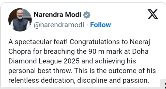 ಡೈಮಂಡ್ ಲೀಗ್ ಕೂಟದಲ್ಲಿ ಜಾವೆಲಿನ್ ಅನ್ನು 90.23 ಮೀಟರ್ ದೂರ ಎಸೆದು, ವೈಯಕ್ತಿಕ ಶ್ರೇಷ್ಠ ಸಾಧನೆ ಮಾಡಿರುವ ನೀರಜ್ ಚೋಪ್ರಾ ಅವರಿಗೆ ಅಭಿನಂದನೆಗಳು. ಇದು ಅವರ ನಿರಂತರ ಸಮರ್ಪಣೆ, ಶಿಸ್ತು ಮತ್ತು ಉತ್ಸಾಹದ ಫಲಿತಾಂಶವಾಗಿದೆ. ಅವರ ಸಾಧನೆಗೆ ದೇಶ ಹೆಮ್ಮೆಪಡುತ್ತದೆ ಎಂದು ಮೋದಿ ಹೇಳಿದ್ದಾರೆ. ನೀರಜ್ ಚೋಪ್ರಾ ಅವರ ಸಾಧನೆಗೆ ನಾಡಿನ ಗಣ್ಯರು ಸಾಮಾಜಿಕ ಮಾಧ್ಯಮಗಳ ಮೂಲಕ ಅಭಿನಂದನೆಗಳನ್ನು ಸಲ್ಲಿಸುತ್ತಿದ್ದಾರೆ. ಇವರಲ್ಲಿ ಕ್ರೀಡಾಪಟುಗಳು, ರಾಜಕೀಯ ನಾಯಕರು, ಸಿನಿಮಾ ತಾರೆಯರು, ಉದ್ಯಮಿಗಳು ಸೇರಿದಂತೆ ಅಭಿಮಾನಿಗಳು ಅಭಿನಂಧನೆಗಳನ್ನು ಹೇಳುತ್ತಿದ್ದಾರೆ. ದೋಹಾದಲ್ಲಿ ಶುಕ್ರವಾರ ರಾತ್ರಿ ನಡೆದ ಡೈಮಂಡ್ ಲೀಗ್ ಕೂಟದಲ್ಲಿ ಜಾವೆಲಿನ್ ಅನ್ನು 90.23 ಮೀಟರ್ ದೂರ ಎಸೆದು, ವೈಯಕ್ತಿಕ ಶ್ರೇಷ್ಠ ಸಾಧನೆ ಪ್ರದರ್ಶಿಸಿದರು.