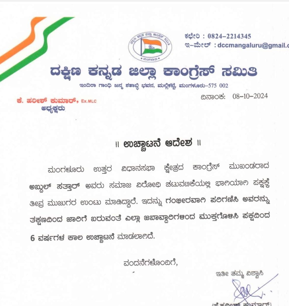 ಇದರ ನಡುವೆ ಮಂಗಳೂರು ಉತ್ತರ ವಿದಾನಸಭಾ ಕ್ಷೇತ್ರದಲ್ಲಿ ಪ್ರಮುಖ ಜವಾಬ್ದಾರಿ ಹೊತ್ತಿದ್ದ ಆರೋಪಿ ಅಬ್ದುಲ್ ಸತ್ತಾರ್ ನನ್ನು ಎಲ್ಲಾ ಜವಾಬ್ದಾರಿಯಿಂದ ಆರು ವರ್ಷಗಳ ಕಾಲ ವಜಾಗೊಳಿಸಿ ಆದೇಶ ಹೊರಡಿಸಿದೆ.