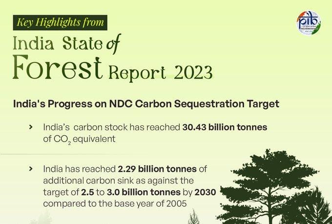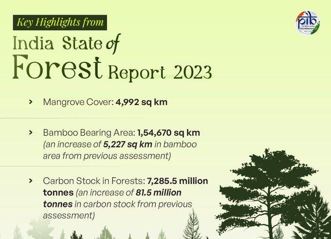 ಭಾರತದ ಅರಣ್ಯ ಸ್ಥಿತಿಗತಿ ವರದಿ (ಐಎಸ್ಎಫ್ಆರ್) 2023 ಅನ್ನು ಉತ್ತರಾಖಂಡದ ಡೆಹ್ರಾಡೂನ್ನಲ್ಲಿ ಶನಿವಾರ ಬಿಡುಗಡೆ ಮಾಡಲಾಯಿತು. ಈ ವರದಿಯ ಪ್ರಕಾರ, ದೇಶದ ಒಟ್ಟಾರೆ ಅರಣ್ಯ ಪ್ರದೇಶವು (Total Forest Cover) 2021ರಲ್ಲಿದ್ದ 7,13,789 ಚ.ಕಿ.ಮೀನಿಂದ 2023ರಲ್ಲಿ 7,15,343 ಚ.ಕಿ.ಮೀ ತಲುಪಿದೆ. ಇದರೊಂದಿಗೆ ದೇಶದ ಒಟ್ಟು ಭೌಗೋಳಿಕ ವ್ಯಾಪ್ತಿಯಲ್ಲಿ ಅರಣ್ಯ ಪ್ರದೇಶದ ಪ್ರಮಾಣ ಶೇ 21.76 ತಲುಪಿದೆ.
