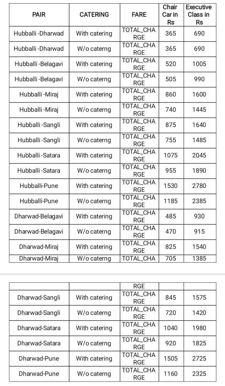 ವಂದೇ ಭಾರತ ರೈಲು ನಿಲುಗಡೆಯಾಗುವ ನಗರಗಳ ಮಧ್ಯದ ದರವನ್ನು ನಿಗದಿಪಡಿಸಿದ್ದು, ದರಪಟ್ಟಿಯನ್ನು ರೈಲ್ವೆ ಇಲಾಖೆಯು ಪ್ರಕಟಿಸಿದೆ. ಚೇರ್ ಕಾರು ಟಿಕೆಟ್ ದರ ಹಾಗೂ ಕ್ಯಾಟರಿಂಗ್ ಹಾಗೂ ನಾನ್ ಕ್ಯಾಟರಿಂಗ್ ಒಳಗೊಂಡಂತೆ ಹಾಗೂ ಎಕ್ಸಿಕ್ಯೂಟಿವ್ ಟಿಕೆಟ್ ದರ ಹಾಗೂ ಕೆಟರಿಂಗ್ ರೇಟ್ ಒಳಗೊಂಡಂತೆ ಟಿಕೆಟ್​ ದರ ಪ್ರಕಟಿಸಿದೆ.