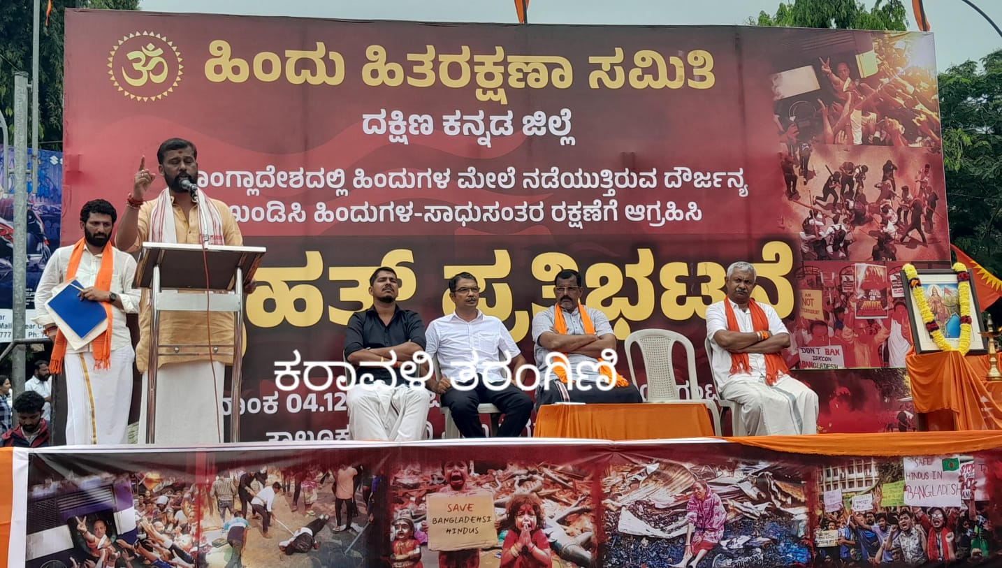 ಮಂಗಳೂರು: ಬಾಂಗ್ಲಾ ಸೇರಿದಂತೆ ಅಂತರ್ ರಾಷ್ಟ್ರೀಯ ಮಟ್ಟದಲ್ಲಿ ಹಿಂದುಗಳನ್ನು ಗುರಿಯಾಗಿಸಿ ದೌರ್ಜನ್ಯ ನಿರಂತರ ವಾಗಿ ನಡೆಯುತ್ತಿದೆ. ಜಗತ್ತಿನಲ್ಲೇ ಹಿಂದುತ್ವ ನಾಶ ಮಾಡಬೇಕು ಎನ್ನುವುದು ಬಾಂಗ್ಲಾ ಸಂಚಿನ ಭಾಗವಾಗಿದೆ ಎಂದು ವಿಶ್ವಹಿಂದೂ ಪರಿಷತ್ ಪ್ರಾಂತ ಕಾರ್ಯದರ್ಶಿ ಶರಣ್ ಪಂಪ್ವೆಲ್ ಹೇಳಿದ್ದಾರೆ. ಹಿಂದೂ ಹಿತರಕ್ಷಣಾ ಸಮಿತಿ ದ.ಕ.ಜಿಲ್ಲೆ ಇದರ ವತಿಯಿಂದ ಬಾಂಗ್ಲಾ ದೇಶದಲ್ಲಿ ನಡೆಯುತ್ತಿರುವ ಹಿಂದುಗಳ ಮೇಲಿನ ದೌರ್ಜನ್ಯ ಖಂಡಿಸಿ, ಅವರ ರಕ್ಷಣೆಗೆ ಆಗ್ರಹಿಸಿ ಮಂಗಳೂರಿನಲ್ಲಿ ಇಂದು ನಡೆದ ಬೃಹತ್ ಪ್ರತಿಭಟನಾ ಮೆರವಣಿಗೆ ಮತ್ತು ಪ್ರತಿಭಟನಾ ಸಭೆಯಲ್ಲಿ ಅವರು ಮಾತನಾಡಿ, ಪಾಕಿಸ್ಥಾನ, ಅಫ್ಘಾನಿಸ್ಥಾನ, ಬರ್ಮಾ, ಮ್ಯಾನ್ಮಾರ್, ಮಾಲ್ಮೀಲ್ಸ್ ಹಿಂದು ವಿರೋಧಿ ಹಾದಿ ತುಳಿದಿದೆ. ಚೀನಾ ಹಾಗೂ ಶ್ರೀಲಂಕ ಎಡಪಕ್ಷಗಳ ಹಿಡಿತದಲ್ಲಿವೆ. ಹಿಂದು ಅಲ್ಪಸಂಖ್ಯಾತರಾಗಿ ಇರುವ ದೇಶಗಳಲ್ಲಿ ದೌರ್ಜನ್ಯ ಹೆಚ್ಚಾಗಿ ನಡೆಯುತ್ತಿವೆ ಎಂದರು.