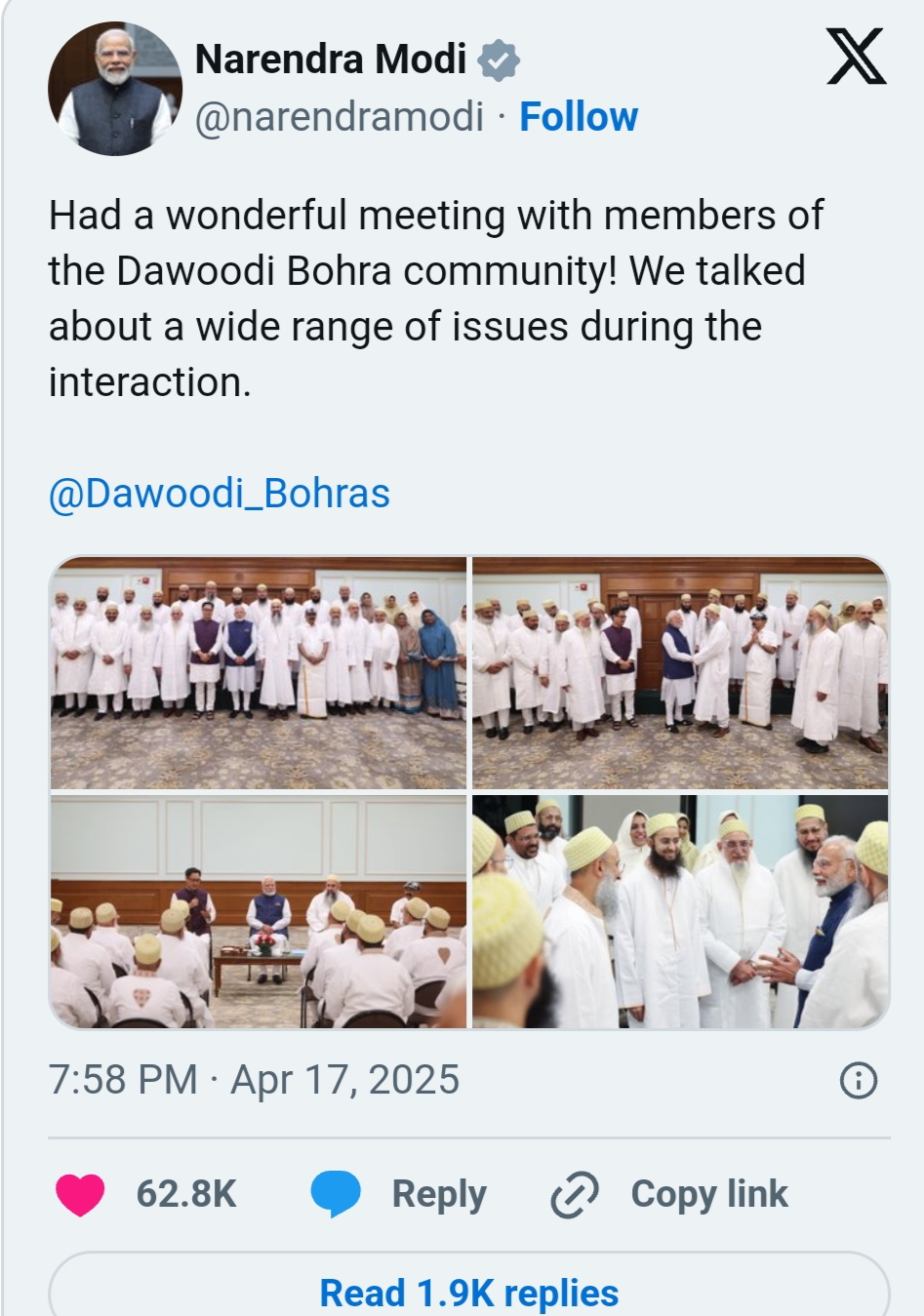 ನಾವು ಪ್ರಧಾನಮಂತ್ರಿಯವರ 'ಸಬ್ಕಾ ಸಾಥ್, ಸಬ್ಬಾ ವಿಕಾಸ್, ಸಬ್ಕಾ ವಿಶ್ವಾಸ್' ಎಂಬ ದೃಷ್ಟಿಕೋನದಲ್ಲಿ ನಂಬಿಕೆ ಇಟ್ಟಿದ್ದೇವೆ ಎಂದು ಅವರು ಪ್ರಧಾನಿ ಮೋದಿಗೆ ಧನ್ಯವಾದ ತಿಳಿಸಿದ್ದಾರೆ. ದಾವೂದಿ ಬೊಹ್ರಾಗಳು ಪಶ್ಚಿಮ ಭಾರತದ ಮುಸ್ಲಿಂ ಸಮುದಾಯವಾಗಿದ್ದು, ಈ ಸಮುದಾಯದವರು ಪ್ರಪಂಚದಾದ್ಯಂತ 40ಕ್ಕೂ ಹೆಚ್ಚು ದೇಶಗಳಲ್ಲಿ ನೆಲೆಸಿದ್ದಾರೆ.