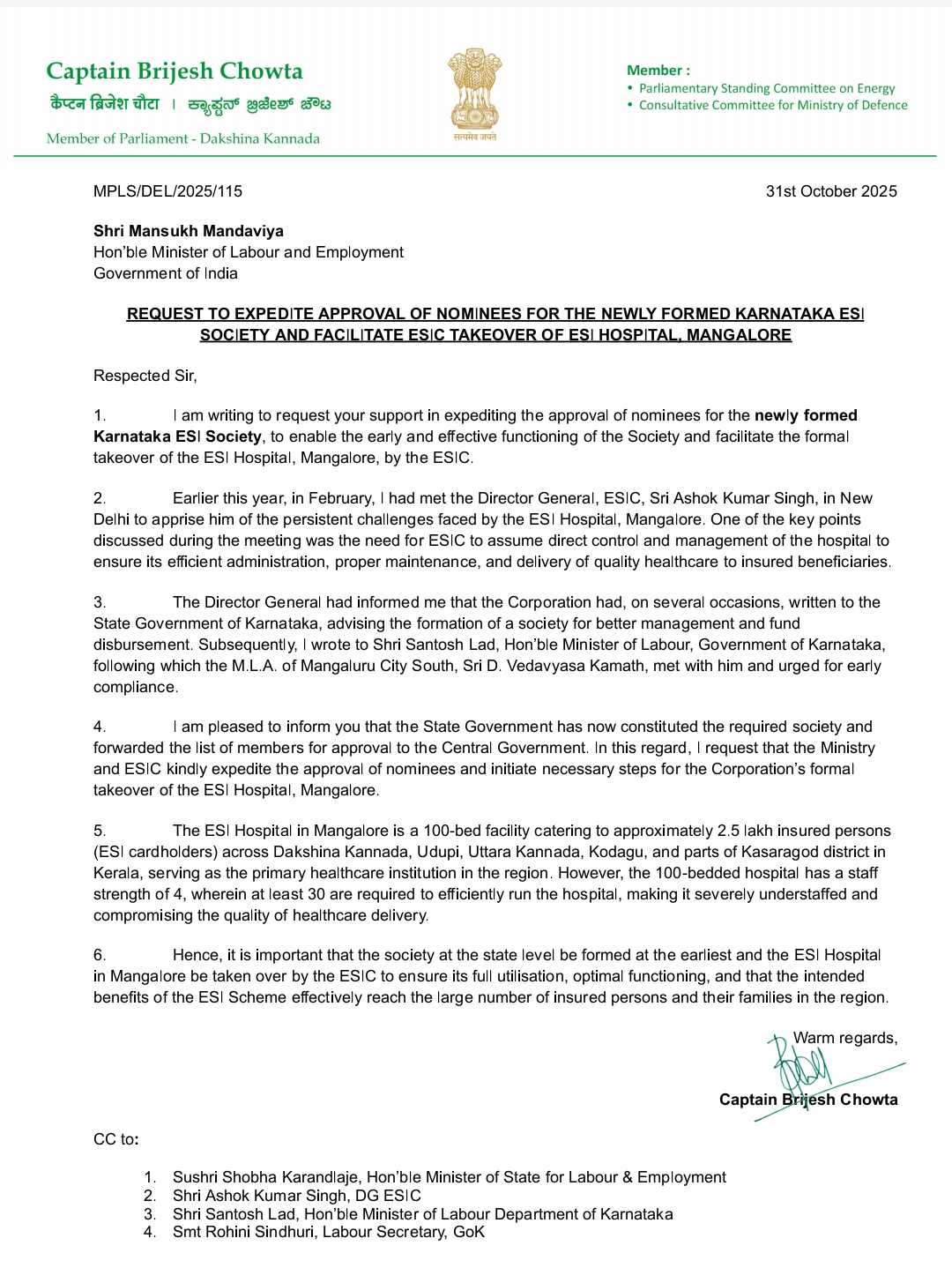 ಕ್ಯಾ. ಚೌಟ ಅವರು, 100 ಹಾಸಿಗೆಗಳ ಸಾಮರ್ಥ್ಯದ ಮಂಗಳೂರು ಇಎಸ್ಐ ಆಸ್ಪತ್ರೆಯ ಸಮಸ್ಯೆಗಳ ಕುರಿತು ಚರ್ಚಿಸಲು ಕಳೆದ ಫೆಬ್ರವರಿಯಲ್ಲಿ ದೆಹಲಿಯಲ್ಲಿ ನೌಕರರ ರಾಜ್ಯ ವಿಮಾ ನಿಗಮದ(ESIC) ಮಹಾನಿರ್ದೇಶಕ ಅಶೋಕ್ ಕುಮಾರ್ ಸಿಂಗ್ ಅವರನ್ನು ಭೇಟಿ ಮಾಡಿ ಮಾತುಕತೆ ನಡೆಸಿದ್ದರು. ಆ ಭೇಟಿ ವೇಳೆ ಇಎಸ್ಐಸಿಗೆ ಸಂಬಂಧಿಸಿದ ರಾಜ್ಯದ ಎಲ್ಲಾ ಕಾರ್ಯ ಚಟುವಟಿಕೆ ಸುಗಮಗೊಳಿಸಲು ಮತ್ತು ಕೇಂದ್ರದಿಂದ ಅನುದಾನ ಬಿಡುಗಡೆಯನ್ನು ಸಮರ್ಥವಾಗಿ ನಿರ್ವಹಿಸಲು ರಾಜ್ಯ ಸರ್ಕಾರವು ಪ್ರತ್ಯೇಕ ಇಎಸ್ಐ ಸೊಸೈಟಿ ರಚಿಸಬೇಕು. ಅದು ರಾಜ್ಯದಲ್ಲಿನ ಎಲ್ಲಾ ಇಎಸ್ಐಸಿಗೆ ಸಂಬಂಧಿಸಿದ ವಿಷಯಗಳಿಗೆ ಮತ್ತು ಕೇಂದ್ರದ ಫಂಡ್ ವಿತರಣೆಗೆ ಆಡಳಿತ ಮಂಡಳಿಯಾಗಿರುತ್ತದೆ ಎಂಬ ಮಹತ್ವದ ಮಾಹಿತಿ ನೀಡಿದ್ದರು. ಏಕೆಂದರೆ ಇಎಸ್ಐ ಆಸ್ಪತ್ರೆಗೆಗಳು ಇಎಸ್ಐಸಿ ನೇರ ನಿಯಂತ್ರಣಕ್ಕೆ ಬಂದರೆ ಅವುಗಳ ದಕ್ಷ ಆಡಳಿತ, ಸೂಕ್ತ ನಿರ್ವಹಣೆ ಮತ್ತು ವಿಮೆ ಮಾಡಿದ ಫಲಾನುಭವಿಗಳಿಗೆ ಗುಣಮಟ್ಟದ ಆರೋಗ್ಯ ಸೇವೆಯನ್ನು ಒದಗಿಸುವುದಕ್ಕೆ ಸಾಧ್ಯವಾಗುತ್ತದೆ.