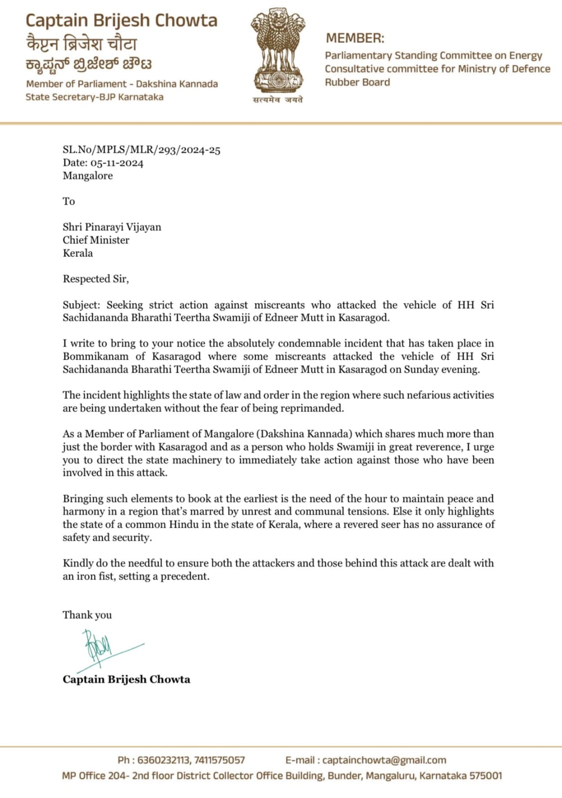 "ಕಾಸರಗೋಡಿನ ಗಡಿಯನ್ನು ಹಂಚಿಕೊಳ್ಳುವ ಮಂಗಳೂರಿನ (ದಕ್ಷಿಣ ಕನ್ನಡ ಲೋಕಸಭಾ ಕ್ಷೇತ್ರ) ಸಂಸದನಾಗಿ ಮತ್ತು ಸ್ವಾಮೀಜಿಯವರ ಮೇಲೆ ಅತೀವ ಗೌರವ ಹೊಂದಿರುವ ವ್ಯಕ್ತಿಯಾಗಿ, ಈ ಕೃತ್ಯದಲ್ಲಿ ಶಾಮೀಲಾದವರ ವಿರುದ್ಧ ತಕ್ಷಣ ಕಠಿಣ ಕಾನೂನು ಕ್ರಮ ಕೈಗೊಳ್ಳಲು ಗೃಹ ಇಲಾಖೆಗೆ ಸೂಕ್ತ ನಿರ್ದೇಶನ ನೀಡಬೇಕೆಂದು" ಸಿಎಂ ಪಿಣರಾಯಿ ವಿಜಯನ್ಗೆ ಒತ್ತಾಯಿಸಿದ್ದಾರೆ.