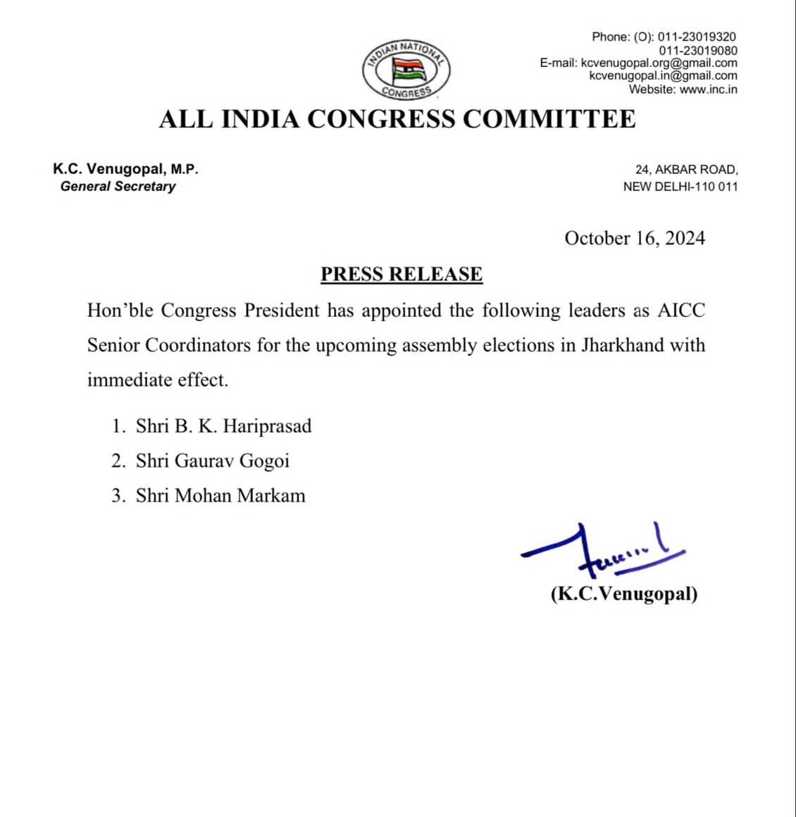 ರಾಷ್ಟ್ರೀಯ ಕಾಂಗ್ರೆಸ್ ಪಕ್ಷದ ಅಧ್ಯಕ್ಷರಾದ ಮಲ್ಲಿಕಾರ್ಜುನ ಖರ್ಗೆ ಅವರ ನಿರ್ದೇಶನದಂತೆ ಬಿ.ಕೆ. ಹರಿಪ್ರಸಾದ್, ಗೌರವ್ ಗೊಗಾಯ್, ಮೋಹನ್ ಮರ್ಕಮ್ ಅವರನ್ನು ನೇಮಕಗೊಳಿಸಿ ಎಐಸಿಸಿ ಪ್ರಧಾನ ಕಾರ್ಯದರ್ಶಿ ಕೆ.ಸಿ. ವೇಣುಗೋಪಾಲ್ ಆದೇಶಿಸಿದ್ದಾರೆ.