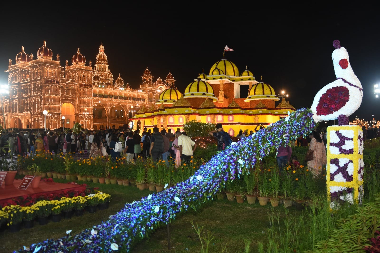 ಅರಮನೆ, ರಾಜ್ಯ ಸರ್ಕಾರದ ಗ್ಯಾರಂಟಿಗಳ ಬಗ್ಗೆ ಕಲಾಕೃತಿ, ಚಾಮುಂಡಿಬೆಟ್ಟದ ನಂದಿ ವಿಗ್ರಹ, ಪಕ್ಷಿಗಳು, ದೆಹಲಿಯ ಅಕ್ಷರಧಾಮ, ಕಾರ್ಗಿಲ್ ವಿಜಯಸ್ತಂಭ, ದಕ್ಷಿಣ ಕಾಶಿಯ ನಂಜುಂಡೇಶ್ವರ, ಗಂಡಭೇರುಂಡ, ಮುಮ್ಮಡಿ ಕೃಷ್ಣರಾಜ ಒಡೆಯರ್ ಪ್ರತಿಕೃತಿ ಸೇರಿದಂತೆ ಹಲವು ವಿಭಿನ್ನ ಚಿತ್ತಾರಗಳನ್ನು ಹೂವುಗಳಲ್ಲಿ ಅರಳಿಸಲಾಗಿದೆ.