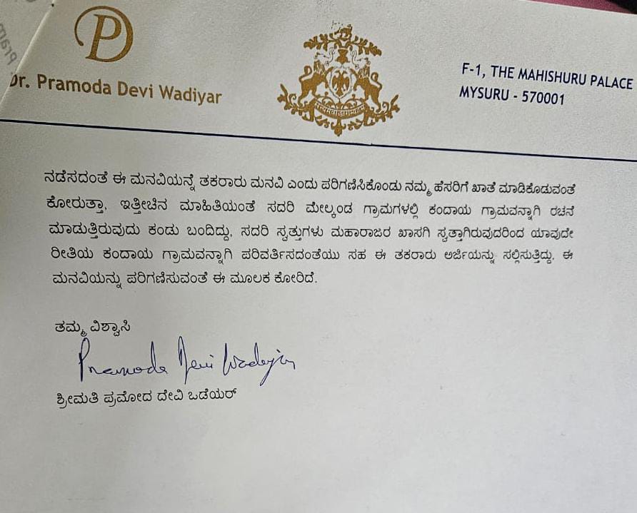 ಇತ್ತೀಚಿನ ಮಾಹಿತಿಯಂತೆ ಈ ಗ್ರಾಮಗಳಲ್ಲಿ ಕಂದಾಯ ಗ್ರಾಮಗಳಾಗಿ ರಚನೆ ಮಾಡುತ್ತಿರುವುದು ಕಂಡು ಬಂದಿದ್ದು, ಸದರಿ ಸ್ವತ್ತುಗಳು ಮಹಾರಾಜರ ಖಾಸಗಿ ಸ್ವತ್ತಾಗಿರುವುದರಿಂದ ಯಾವುದೇ ರೀತಿಯ ಕಂದಾಯ ಗ್ರಾಮವನ್ನಾಗಿ ಪರಿವರ್ತಿಸದಂತೆಯೂ ಸಹ ಈ ತಕರಾರು ಅರ್ಜಿಯನ್ನು ಸಲ್ಲಿಸುತ್ತಿದ್ದು, ಈ ಮನವಿಯನ್ನು ಪರಿಗಣಿಸುವಂತೆ ರಾಜವಂಶಸ್ಥೆ ಪ್ರಮೋದಾದೇವಿ ಒಡೆಯರ್ ಕೋರಿದ್ದಾರೆ.