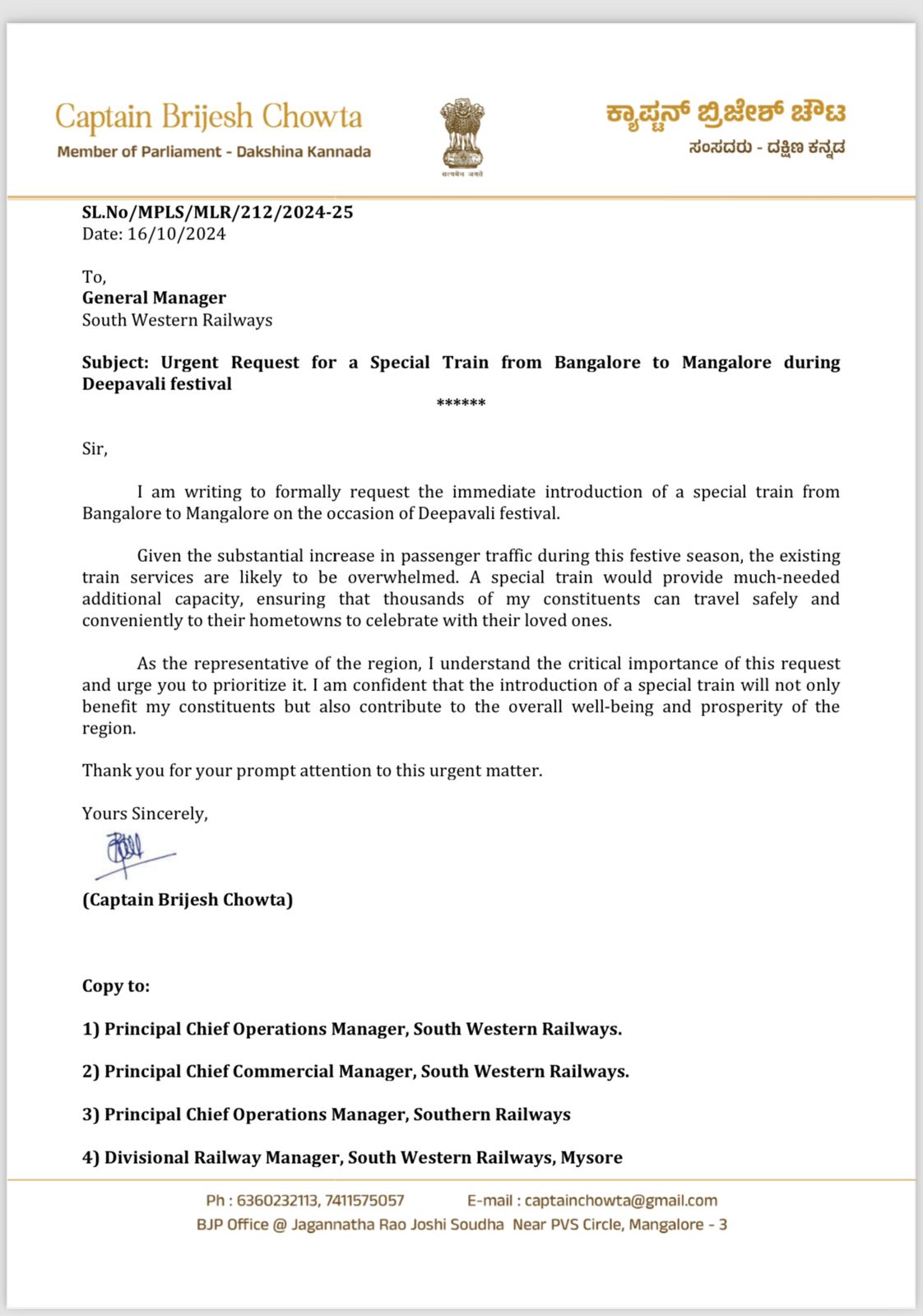 ಹೀಗಾಗಿ, ದೀಪಾವಳಿ ಹಬ್ಬಕ್ಕೆ ಕರಾವಳಿ ಭಾಗದ ಜನರಿಗೆ ಅನುಕೂಲವಾಗುವಂತೆ ವಿಶೇಷ ರೈಲು ಸಂಚಾರದ ವ್ಯವಸ್ಥೆ ಮಾಡುವಂತೆ ಸಂಸದ ಕ್ಯಾ. ಚೌಟ ಅವರು ನೈರುತ್ಯ ರೈಲ್ವೆ ವಲಯಕ್ಕೆ ಹಾಗೂ ರೈಲ್ವೆ ಇಲಾಖೆಯ ಸಂಬಂಧಪಟ್ಟ ಅಧಿಕಾರಿಗಳಿಗೆ ಮನವಿ ಮಾಡಿದ್ದರು. ಇದೀಗ ಮನವಿಗೆ ಶೀಘ್ರ ಸ್ಪಂದಿಸಿ ವಿಶೇಷ ರೈಲು ಸೇವೆ ಮಂಜೂರು ಮಾಡಿರುವುದಕ್ಕೆ ಕ್ಯಾ. ಚೌಟ ಅವರು ರೈಲ್ವೆ ಸಚಿವರಾದ ಅಶ್ವಿನ್ ವೈಷ್ಣವ್, ರೈಲ್ವೆ ಖಾತೆ ರಾಜ್ಯ ಸಚಿವರಾದ ವಿ. ಸೋಮಣ್ಣ ಹಾಗೂ ರೈಲ್ವೆ ಇಲಾಖೆ ಅಧಿಕಾರಿಗಳಿಗೆ ಕೃತಜ್ಞತೆ ಸಲ್ಲಿಸಿದ್ದಾರೆ.