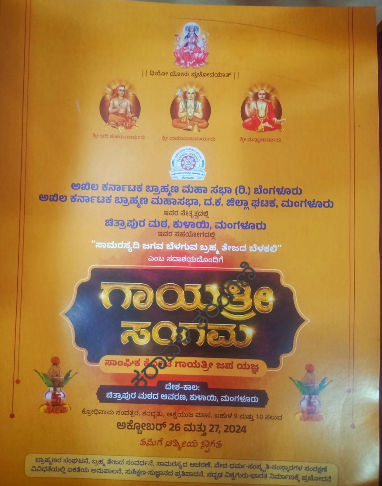 ಮಂಗಳೂರು: ಅಖಿಲ ಕರ್ನಾಟಕ ಬ್ರಾಹ್ಮಣ ಮಹಾಸಭಾ ಕೇಂದ್ರ ಸಮಿತಿ ಹಾಗೂ ಮಹಾಸಭಾದ ದಕ್ಷಿಣ ಕನ್ನಡ ಜಿಲ್ಲಾ ಘಟಕ ಜಂಟಿಯಾಗಿ ಮಂಗಳೂರಿನ ಚಿತ್ರಾಪುರ ಮಠದ ಸಹಕಾರದೊಂದಿಗೆ ಗಾಯತ್ರಿ ಸಂಗಮ ಸಾಂಘಿಕ ಕೋಟಿ ಗಾಯತ್ರಿ ಜಪಯಜ್ಝವನ್ನು ಅ.27 ರಂದು ಮಂಗಳೂರಿನ ಕುಳಾಯಿ ಚಿತ್ರಾಪುರ ಶ್ರಿ