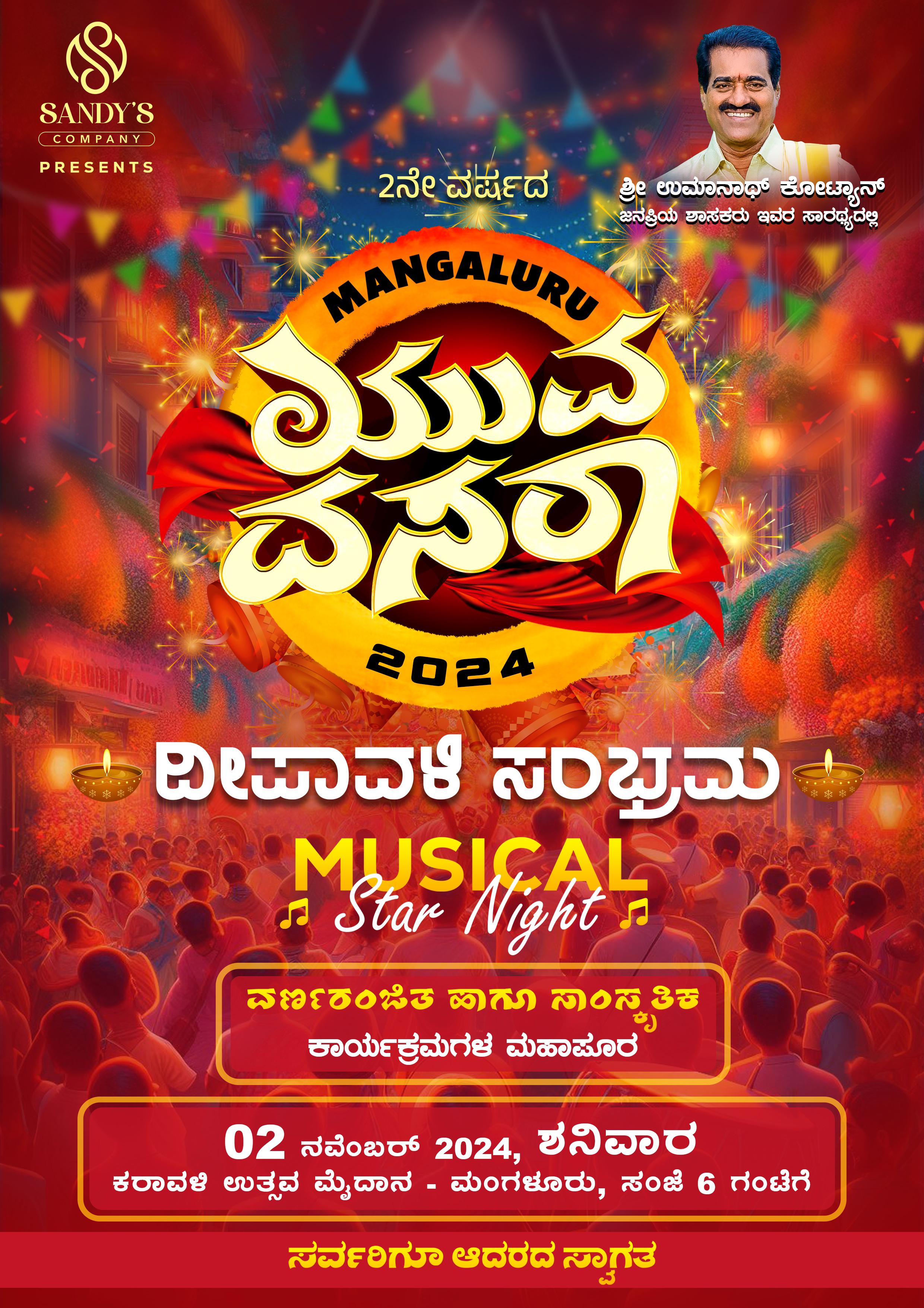 ಮಂಗಳೂರು: ಸ್ಯಾಂಡೀಸ್ ಕಂಪೆನಿ ಅರ್ಪಿಸುವ, ಶಾಸಕ ಉಮಾನಾಥ ಕೋಟ್ಯಾನ್ ಇವರ ಸಾರಥ್ಯದಲ್ಲಿ ನಡೆಯಲಿರುವ ಎರಡನೇ ವರ್ಷದ "ಮಂಗಳೂರು ಯುವ ದಸರಾ 2024 ಸ್ಟಾರ್ ಮ್ಯೂಸಿಕಲ್ ನೈಟ್" ಕಾರ್ಯಕ್ರಮವು ನವೆಂಬರ್ 2ರಂದು ಮಂಗಳೂರಿನ ಕರಾವಳಿ ಉತ್ಸವ ಗೌಂಡಿನಲ್ಲಿ ದೀಪಾವಳಿಯ ಸಂಭ್ರಮದೊಂದಿಗೆ ಸಂಜೆ 6.00 ಗಂಟೆಗೆ ನಡೆಯಲಿದೆ ಎಂದು ಮೂಡುಬಿದಿರೆ ಶಾಸಕ ಉಮಾನಾಥ ಕೋಟ್ಯಾನ್ ತಿಳಿಸಿದರು. ಅವರು ನಗರದ ಪತ್ರಿಕಾ ಭವನದಲ್ಲಿ ಆಯೋಜಿಸಿದ್ದ ಪತ್ರಿಕಾಗೋಷ್ಠಿಯಲ್ಲಿ ಮಾತನಾಡಿ, ದಸರಾ ಸಮಯದಲ್ಲಿ ನಡೆಯಬೇಕಿದ್ದ ಈ ಕಾರ್ಯಕ್ರಮ ಚುನಾವಣಾ ನೀತಿ ಸಂಹಿತೆ ಕಾರಣದಿಂದ ಮುಂದೂಡಲಾಗಿತ್ತು ಎಂದರು.