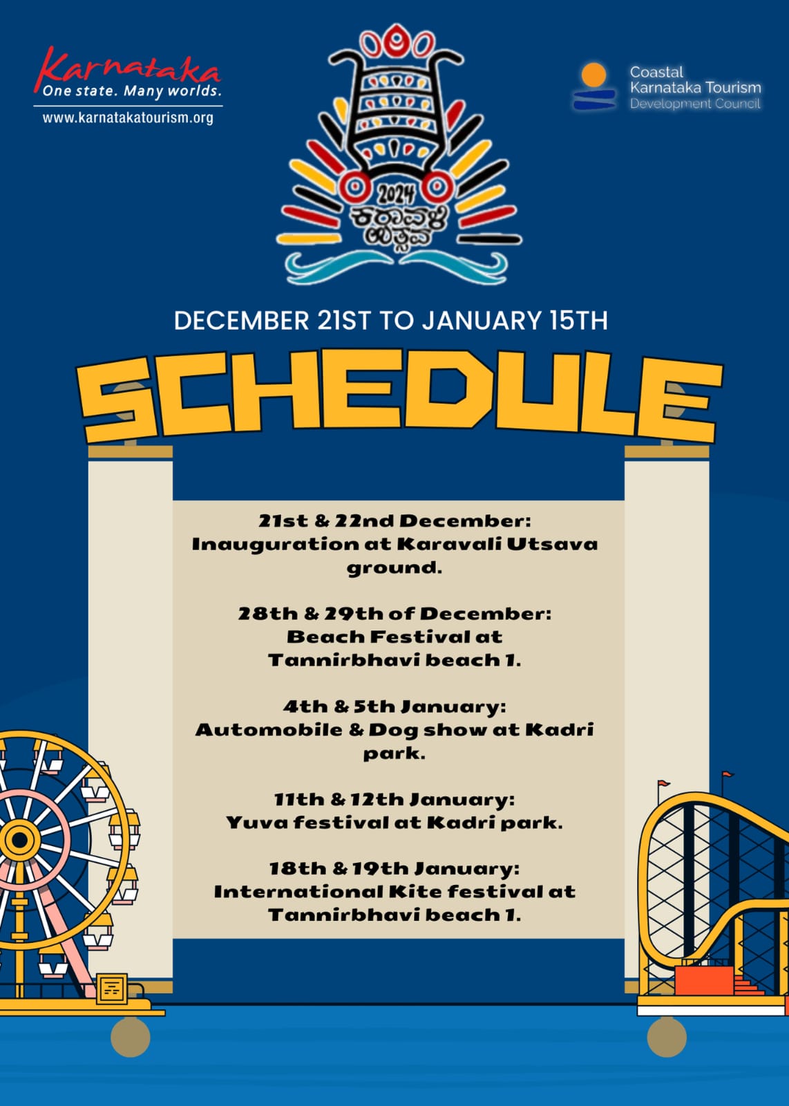 ಜನವರಿ 4 ಮತ್ತು 5 ರಂದು ಕದ್ರಿ ಪಾರ್ಕ್ ನಲ್ಲಿ ಆಟೋಮೊಬೈಲ್ ಮತ್ತು ಶ್ವಾನ ಪ್ರದರ್ಶನ ನಡೆಯಲಿದ್ದು, ಜನವರಿ 11 ಮತ್ತು 12 ರಂದು ಕದ್ರಿ ಪಾರ್ಕ್ ನಲ್ಲಿ ಯುವ ಉತ್ಸವ ನಡೆಯಲಿದೆ. ಜನವರಿ 18 ಮತ್ತು 19 ರಂದು ತಣ್ಣೀರು ಬಾವಿ ಬೀಚ್ ನಲ್ಲಿ ಸುಪ್ರಸಿದ್ದ ಅಂತರಾಷ್ಟ್ರೀಯ ಗಾಳಿಪಟ ಉತ್ಸವ ನಡೆಯಲಿದೆ ಎಂದು ಮಾಹಿತಿ ನೀಡಿದರು.