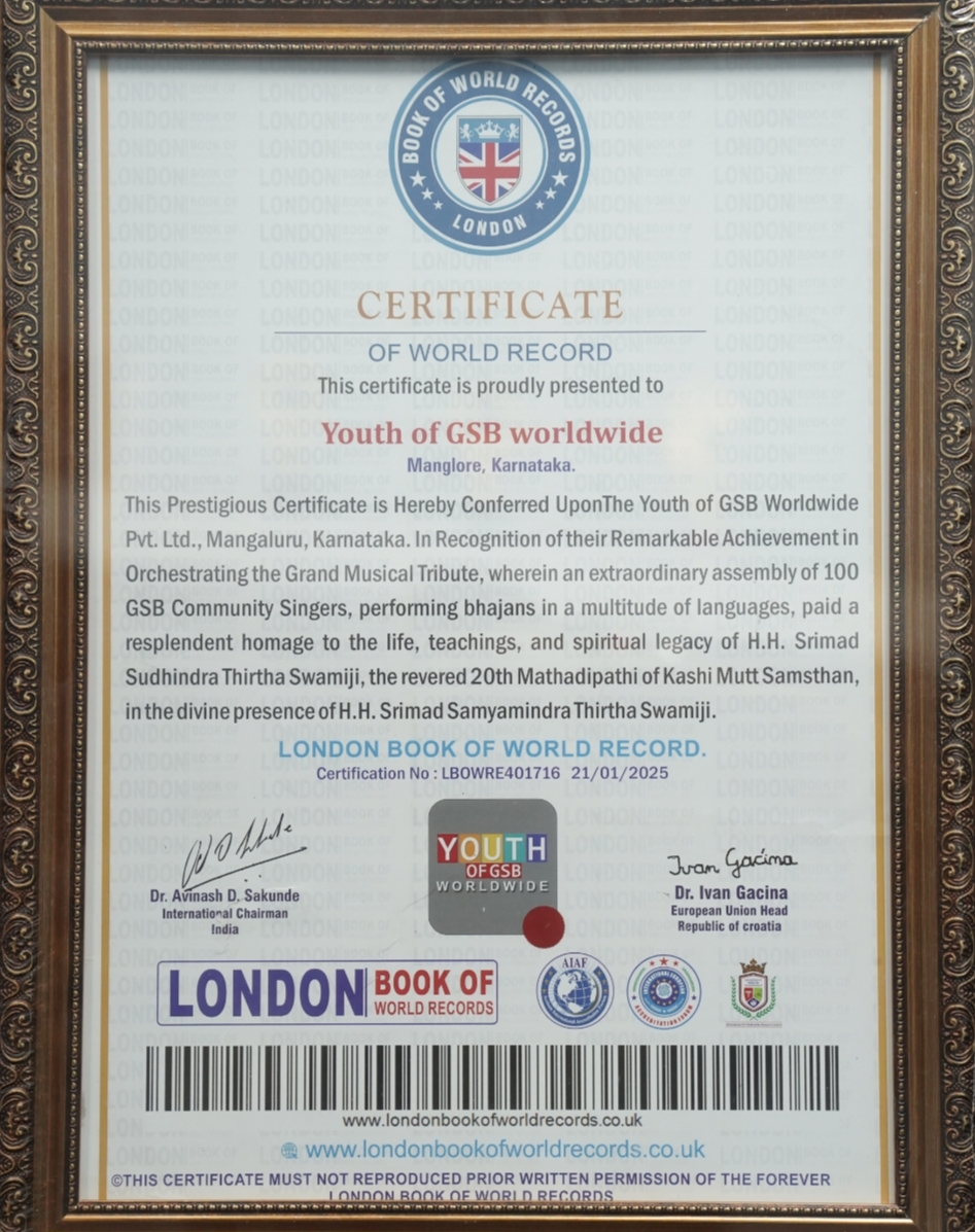 ಮಂಗಳೂರು: ಗೌಡ ಸಾರಸ್ವತ ಬ್ರಾಹ್ಮಣ ಸಮುದಾಯದ, ಕಾಶೀಮಠ ಗುರುಪರಂಪರೆಯ 20 ನೇ ಯತಿ, ಮಹಾನ್ ಯೋಗಿ, ಮಾತನಾಡುವ ದೇವರೆಂದೇ ಭಕ್ತರು ನಂಬಿಕೊಂಡ ಬಂದಿರುವ ಶ್ರೀಮದ್ ಸುಧೀಂದ್ರ ತೀರ್ಥ ಸ್ವಾಮೀಜಿಯವರ ಜನ್ಮಶತಮಾನೋತ್ಸವದ ಅಂಗವಾಗಿ ನಡೆದ ವಿಶಿಷ್ಟ ಕಾರ್ಯಕ್ರಮ ಲಂಡನ್ ಬುಕ್ ಆಫ್ ವಲ್ಡ್ ರೆಕಾರ್ಡ್ ನಲ್ಲಿ ಸ್ಥಾನ ಪಡೆದುಕೊಂಡಿದೆ.
