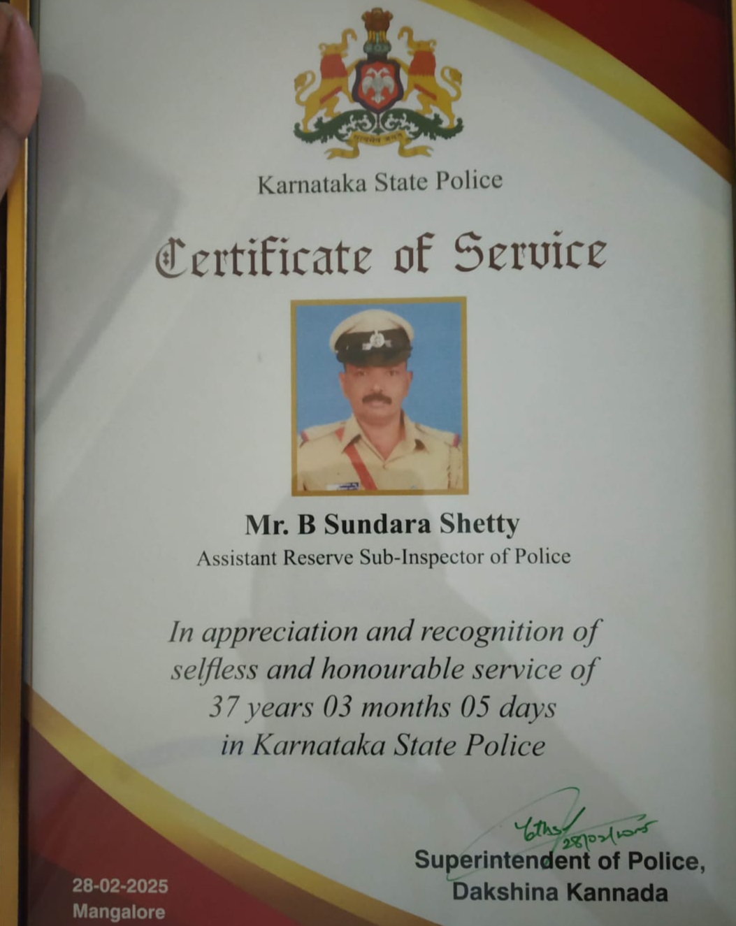 ಮಂಗಳೂರು:ಪೊಲೀಸ್ ಇಲಾಖೆಯಲ್ಲಿ ಅಸಿಸ್ಟೆಂಟ್ ರಿಸರ್ವ್ ಪೊಲೀಸ್ ಸಬ್ ಇನ್ಸ್ ಪೆಕ್ಟರ್ ಆಗಿ ಕಾರ್ಯ ನಿರ್ವಹಿಸುತ್ತಿದ್ದ ಬಿ ಸುಂದರ ಶೆಟ್ಟಿ ಅವರು ಸುಮಾರು 37 ವರ್ಷಗಳ ಸುಧೀರ್ಘ ಸೇವೆ ಬಳಿಕ ನಿವೃತ್ತರಾಗಿದ್ದಾರೆ. ಅವರನ್ನು ಜಿಲ್ಲಾ ಎಸ್ಪಿ ಯತೀಶ್ ಎನ್. ಆಡಿಷನ್ ಎಸ್ಪಿ ರಾಜೇಂದ್ರ ಅವರು ಸರಳ ಸಮಾರಂಭದಲ್ಲಿ ಸನ್ಮಾನಿಸಿ ಬೀಳ್ಕೊಟ್ಟರು.