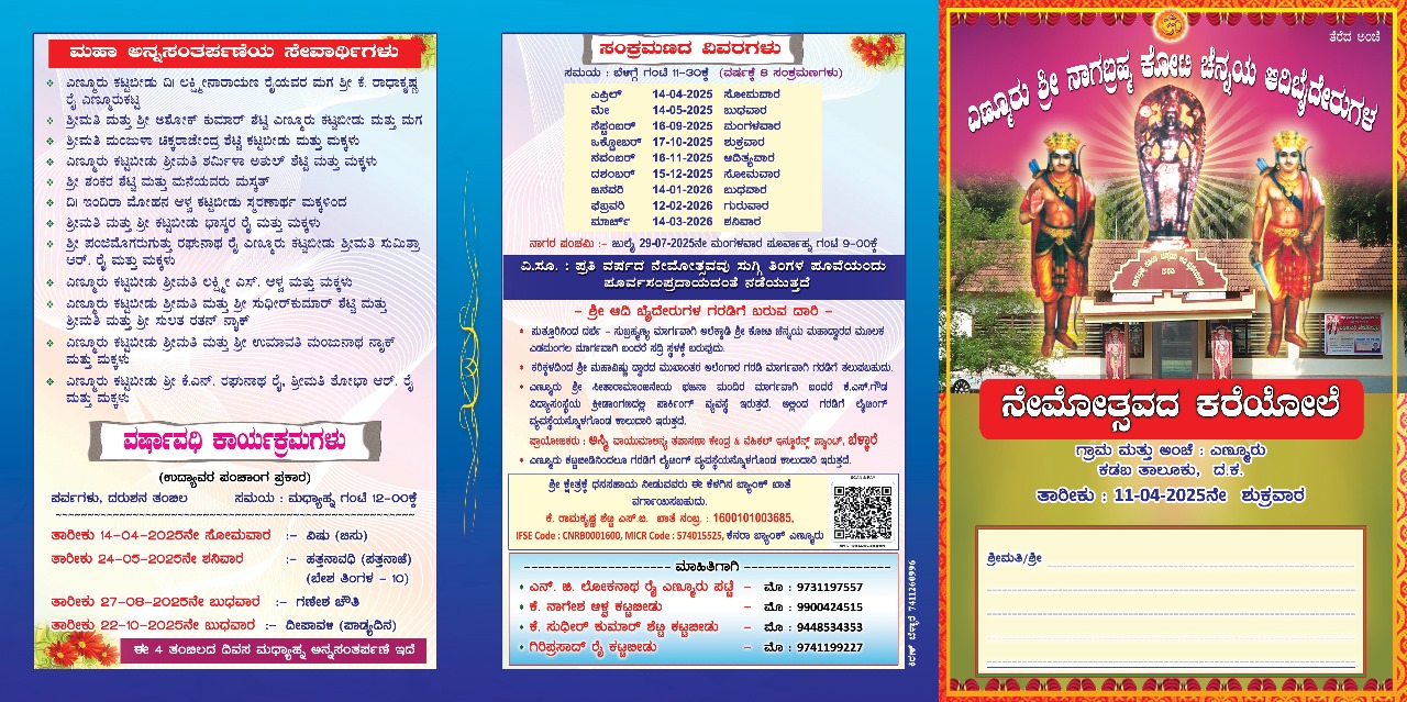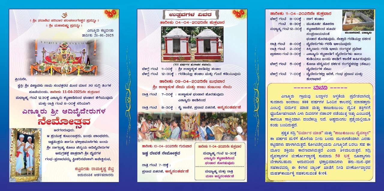 ಎ.11ರಂದು ಮಧ್ಯಾಹ್ನ 12.30ಕ್ಕೆ ಎಣ್ಮೂರು ಕಟ್ಟಬೀಡಿನಿಂದ ಭಂಡಾರ ತೆಗೆದು ರಾತ್ರಿ 8ಗಂಟೆಗೆ ಎಣ್ಮೂರು ಆದಿಬೈದೇರುಗಳ ನೇಮೋತ್ಸವ ನಡೆಯಲಿದೆ ಪ್ರಕಟಣೆ ತಿಳಿಸಿದೆ.
