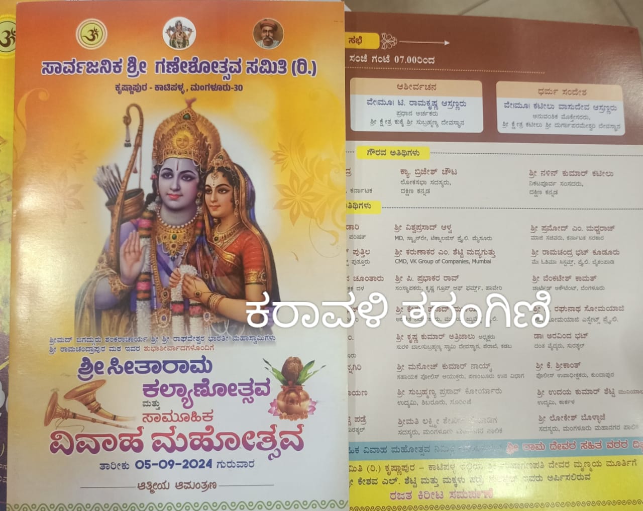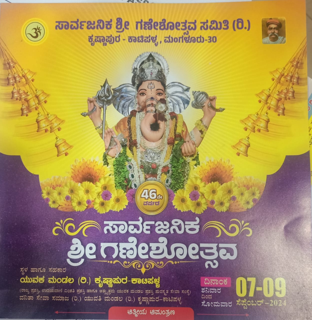 ಮಂಗಳೂರು: ಸಾರ್ವಜನಿಕ ಶ್ರೀ ಗಣೇಶೋತ್ಸವ ಸಮಿತಿ (ರಿ) ಕೃಷ್ಣಾಪುರ ಕಾಟಿಪಳ್ಳ ಇದರ ವತಿಯಿಂದ ನಡೆಯುವ ಶ್ರೀ ಗಣೇಶೋತ್ಸವವು 46 ನೇ ವರ್ಷದ ಸಂಭ್ರಮದಲ್ಲಿದೆ ವಿವಿಧ ಸಮಾಜಮುಖಿ ಕಾರ್ಯಕ್ರಮಗಳಿಗೆ ಈಗಾಗಲೇ ಚಾಲನೆ ನೀಡಲಾಗಿದೆ ವಿಶೇಷವಾಗಿ ಸೆಪ್ಟೆಂಬರ್ 5 ರಂದು ಶ್ರೀ ಸೀತಾರಾಮ ಕಲ್ಯಾಣೋತ್ಸವ ಮತ್ತು ಸಾಮು ವಿವಾಹ ಮಹೋತ್ಸವವನ್ನು ಆಯೋಜಿಸಲಾಗಿದೆ.