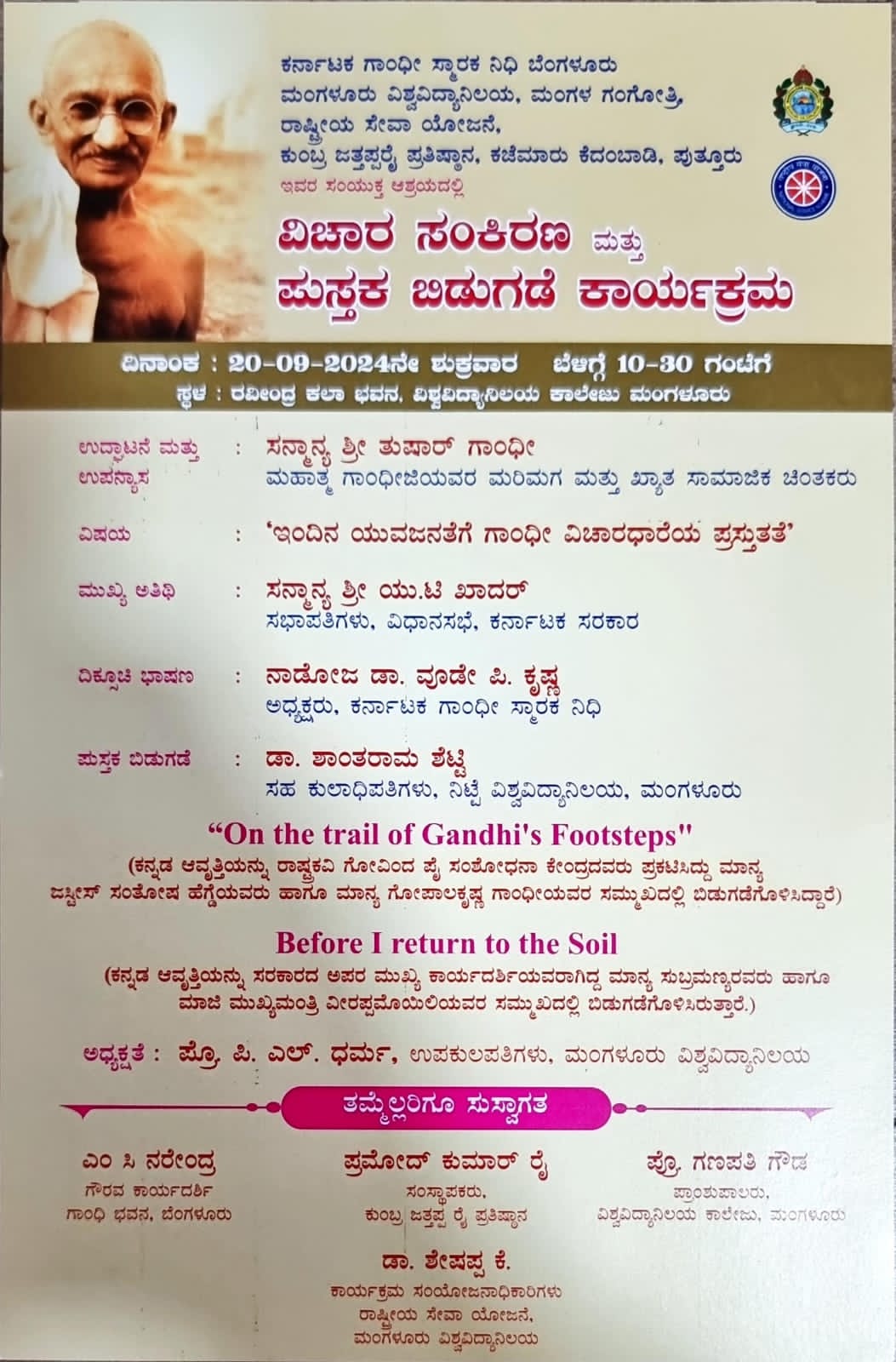 ಸಮಾರಂಭವನ್ನು ತುಷಾರ್ ಗಾಂಧಿಯವರು ಉದ್ಘಾಟಿಸಿದರೆ, ಸಭಾಪತಿ ಯು. ಟಿ. ಖಾದರ್ ಮುಖ್ಯ ಅತಿಥಿಯಾಗಿರುವರು. ಕಾರ್ಯಕ್ರಮದ ಅಧ್ಯಕ್ಷತೆಯನ್ನು ಮಂಗಳೂರು ವಿಶ್ವವಿದ್ಯಾನಿಲಯದ ಕುಲಪತಿ ಪಿ.ಎಲ್. ಧರ್ಮ ವಹಿಸಲಿದ್ದಾರೆ. ಕರ್ನಾಟಕ ಗಾಂಧೀ ಸ್ಮಾರಕ ನಿಧಿಯ ಅಧ್ಯಕ್ಷ ನಾಡೋಜ ಡಾ.ವೂಡೇ ಪಿ. ಕೃಷ್ಣ ದಿಕ್ಸೂಚಿ ಭಾಷಣ ಮಾಡುವರು. ಕುಂಬ್ರ ಜತ್ತಪ್ಪ ರೈ ಪ್ರತಿಷ್ಠಾನದ ಸಂಸ್ಥಾಪಕ ಪ್ರಮೋದ್ ಕುಮಾರ್ ರೈಯವರು ರಚಿಸಿರುವ ‘ಆನ್ ದ ಟ್ರೈಲ್ ಆಫ್ ಗಾಂಧೀಸ್ ಪುಟ್ಸ್ಟೆಪ್ಸ್’ ಹಾಗೂ ‘ಬಿಪೋರ್ ಐ ರಿಟರ್ನ್ ಟು ದ ಸೊಲ್’ ಕೃತಿಗಳನ್ನು ನಿಟ್ಟೆ ವಿ. ವಿ. ಸಹ ಕುಲಾಧಿಪತಿ ಡಾ. ಶಾಂತರಾಮ ಶೆಟ್ಟಿಯವರು ಈ ಸಂದರ್ಭ ಬಿಡುಗಡೆಗೊಳಿಸುವರು.
