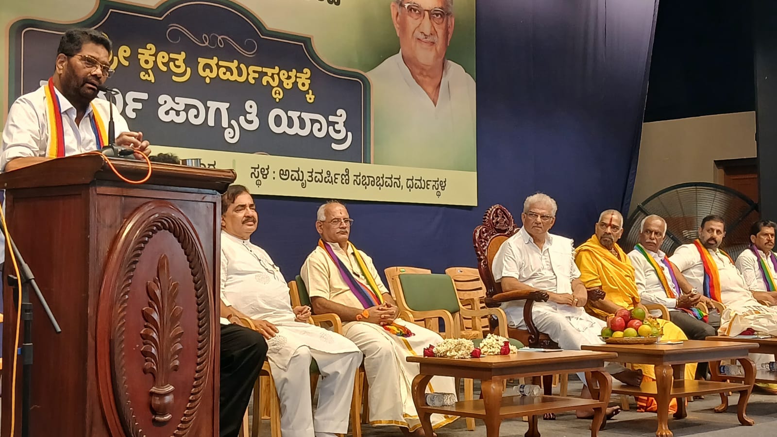 ಉಜಿರೆಯಿಂದ ಧರ್ಮಸ್ಥಳಕ್ಕೆ ತೆರಳುವ ರಸ್ತೆಯಲ್ಲಿ ಕಿಲೋಮೀಟರ್ಗಟ್ಟಲೆ ವಾಹನಗಳು ಸಹಕಾರಿ ಧ್ವಜದೊಂದಿಗೆ ಸರತಿ ಸಾಲಿನಲ್ಲಿ ತೆರಳಿ, ಅಲ್ಲಿನ ಅಮೃತವರ್ಷಿಣಿ ಸಭಾಭವನದಲ್ಲಿ ಧರ್ಮ ಜಾಗೃತಿ ಸಭಾ ಕಾರ್ಯಕ್ರಮ ನಡೆಯಿತು. ಕಾರ್ಯಕ್ರಮದಲ್ಲಿ ಮಾತನಾಡಿದ ಡಾ. ರಾಜೇಂದ್ರ ಕುಮಾರ್ ಧರ್ಮಸ್ಥಳ ಕ್ಷೇತ್ರಕ್ಕೆ ಅಪಪ್ರಚಾರವಾದಾಗ ಇಡೀ ನಾಡು ಜಾತಿ-ಧರ್ಮ ಭೇದ ಬಿಟ್ಟು ಒಂದಾಗಿದೆ. ಧಾರ್ಮಿಕ ಕ್ಷೇತ್ರಕ್ಕೆ ಆಗುತ್ತಿರುವ ಅನ್ಯಾಯವನ್ನು ನಾವು ಒಂದಾಗಿ ಖಂಡಿಸಲೇಬೇಕಾಗಿದೆ. ಧರ್ಮ ಸ್ಥಳದ ಬಗ್ಗೆ ಆಗುತ್ತಿರುವ ಅಪಪ್ರಚಾರ ಹಾಗೂ ಸುಳ್ಳು ವದಂತಿ ಖಂಡಿಸಿ ಸರ್ವ ಸಹಕಾರಿಗಳು ಧರ್ಮಾಧಿ ಕಾರಿ ಡಾ.ವೀರೇಂದ್ರ ಹೆಗ್ಗಡೆಯವರ ಬೆಂಬಲಕ್ಕೆ ನಿಂತಿದ್ದೇವೆ. ಆ ಕಾರಣದಿಂದಲೇ ಧರ್ಮಜಾಗೃತಿ ಯಾತ್ರೆ ಕೈಗೊಳ್ಳಲಾಗಿದೆ ಎಂದು ದಕ್ಷಿಣ ಕನ್ನಡ ಜಿಲ್ಲಾ ಕೇಂದ್ರ ಸಹಕಾರಿ ಬ್ಯಾಂಕ್ ಅಧ್ಯಕ್ಷ, ಸಹಕಾರಿ ರತ್ನ ಡಾ. ಎಂ.ಎನ್.ರಾಜೇಂದ್ರ ಕುಮಾರ್ ಹೇಳಿದರು. ನಾವೆಲ್ಲರೂ ಡಾ.ಡಿ.ವೀರೇಂದ್ರ ಹೆಗ್ಗಡೆಯವರ ಜತೆಗಿದ್ದು, ಯಾರಿಗೂ ಅನ್ಯಾಯವಾಗದ ರೀತಿಯಲ್ಲಿ ಧರ್ಮಸ್ಥಳ ಕ್ಷೇತ್ರದ ರಕ್ಷಣೆಗೆ ಬದ್ಧರಾಗಿದ್ದೇವೆ. ಇದರಿಂದ ಮನಸ್ಸಿಗೂ ಶಾಂತಿ, ನೆಮ್ಮದಿ ದೊರಕುತ್ತದೆ ಎಂದರು.
