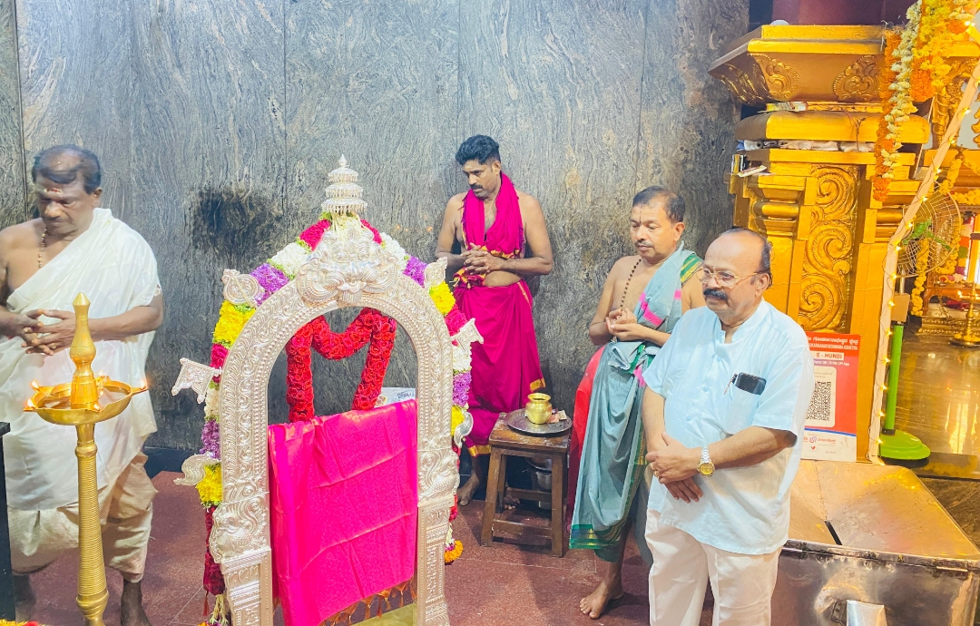 ಮಂಗಳೂರು: ಕುದ್ರೋಳಿ ಶ್ರೀ ಗೋಕರ್ಣನಾಥ ಕ್ಷೇತ್ರದ ಶ್ರೀ ಕಾಳಭೈರವ ದೇವರಿಗೆ ಕುದ್ರೋಳಿ ಕ್ಷೇತ್ರದ ಸ್ಥಾಪಕ ಅಧ್ಯಕ್ಷರಾದ ಸಾವ್ಕಾರ್ ಕೊರಗಪ್ಪರವರ ಪುತ್ರ ದಿ.ಸೋಮಸುಂದರಂ ಕುಟುಂಬಸ್ಥರು ಸುಮಾರು 9 ಲಕ್ಷ ರೂಪಾಯಿ ವೆಚ್ಚದಲ್ಲಿ 6 ಕೆ.ಜಿ. ತೂಕ ಬೆಳ್ಳಿಯ ಪ್ರಭಾವಳಿಯನ್ನು ಕೊಡುಗೆಯಾಗಿ ನೀಡಿದ್ದು, ಶುಕ್ರವಾರ ಸಮರ್ಪಿಸಲಾಯಿತು.