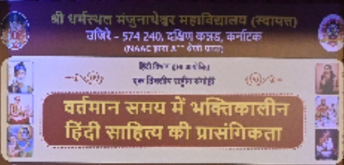 ಉಜಿರೆ : ಉಜಿರೆಯ ಶ್ರೀ ಧರ್ಮಸ್ಥಳ ಮಂಜುನಾಥೇಶ್ವರ ಸ್ವಾಯತ್ತ ಮಹಾವಿದ್ಯಾಲಯ ಹಿಂದಿ ವಿಭಾಗದ ವತಿಯಿಂದ ಎಸ್.ಡಿ.ಎಂ ಶಿಕ್ಷಣ ಸಂಸ್ಥೆಗಳ ಕಾರ್ಯದರ್ಶಿ ಡಾ. ಸತೀಶ್ಚಂದ್ರ ಎಸ್. ಮಾರ್ಗದರ್ಶನದಲ್ಲಿ ಆಯೋಜಿಸಿದ್ದ 'ವರ್ತಮಾನದಲ್ಲಿ ಭಕ್ತಿಕಾಲೀನ ಹಿಂದಿ ಸಾಹಿತ್ಯದ ಪ್ರಸ್ತುತತೆ' ವಿಚಾರದ ಕುರಿತಾದ ಒಂದು ದಿನದ ರಾಷ್ಟ್ರೀಯ ವಿಚಾರ ಸಂಕಿರಣದ ಸಮಾರೋಪ ಸಮಾರಂಭ ಕಾರ್ಯಕ್ರಮ ನಡೆಯಿತು. ಸಮಾರೋಪ ಸಮಾರಂಭದ ಅಧ್ಯಕ್ಷತೆಯನ್ನು ವಹಿಸಿದ್ದ ಎಸ್.ಡಿ.ಎಂ (ಸ್ವಾಯತ್ತ) ಕಾಲೇಜಿನ ಆಡಳಿತ ಕುಲಸಚಿವ ಪ್ರೊ. ಶ್ರೀಧರ ಎನ್. ಭಟ್ ಮಾತನಾಡಿ, ಜಾತಿ ಧರ್ಮ, ಮಥ ಪಂಥಗಳನ್ನು ಮೀರಿ ನಿಲ್ಲುವ ನೌತಿಕ ಶಕ್ತಿ ಸಾಹಿತ್ಯಕಿದೆ. ಭಕ್ತಿ ಕಾಲದ ಹಿಂದಿ ಸಾಹಿತ್ಯದಲ್ಲಿ ಸಂತ ಕಬೀರ್, ಗುರು ನಾನಕ್, ತುಳಸಿ ದಾಸ್ ರಂತಹ ಮಹನೀಯರು ಧಾರ್ಮಿಕ ಶ್ರದ್ಧೆ, ಸಾಮಾಜಿಕ ಪ್ರಗತಿ ಮತ್ತು ಮಾನವೀಯ ಮೌಲ್ಯಗಳನ್ನು ಸಾರುವ ಚಿಂತನೆಯನ್ನು ಬೋಧಿಸುತ್ತದೆ ಎಂದರು.